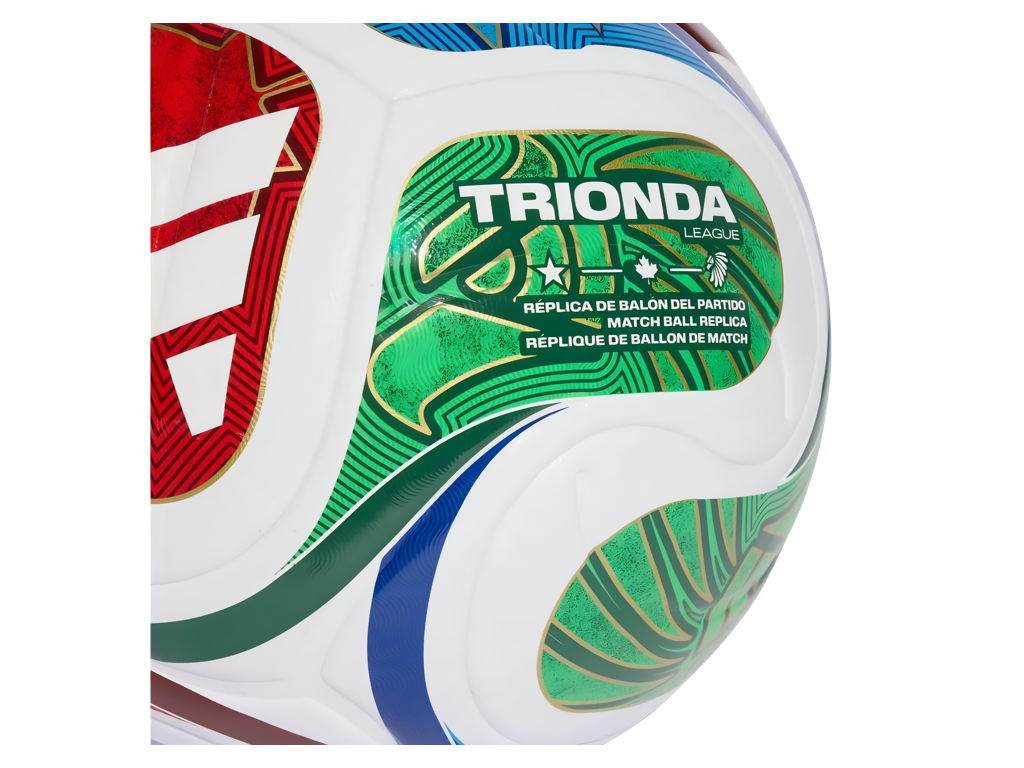 Zápasový míč adidas Trionda League ve velikosti 4 s oficiálním designem FIFA World Cup 2026. Čtyřpanelový bezešvý povrch z recyklovaného TPU zajišťuje předvídatelnou letovou dráhu, přesné přihrávky a nízký příjem vody. Texturovaný reliéf s jemným debossingem zlepšuje stabilitu v letu a kontrolu míče. Výrazná grafika s motivy tří hostitelských zemí — hvězdami USA, javorovým listem Kanady a orlem Mexika — odráží design oficiálního zápasového míče turnaje. Míč je certifikovaný FIFA Quality a hodí se na trénink i zápas.