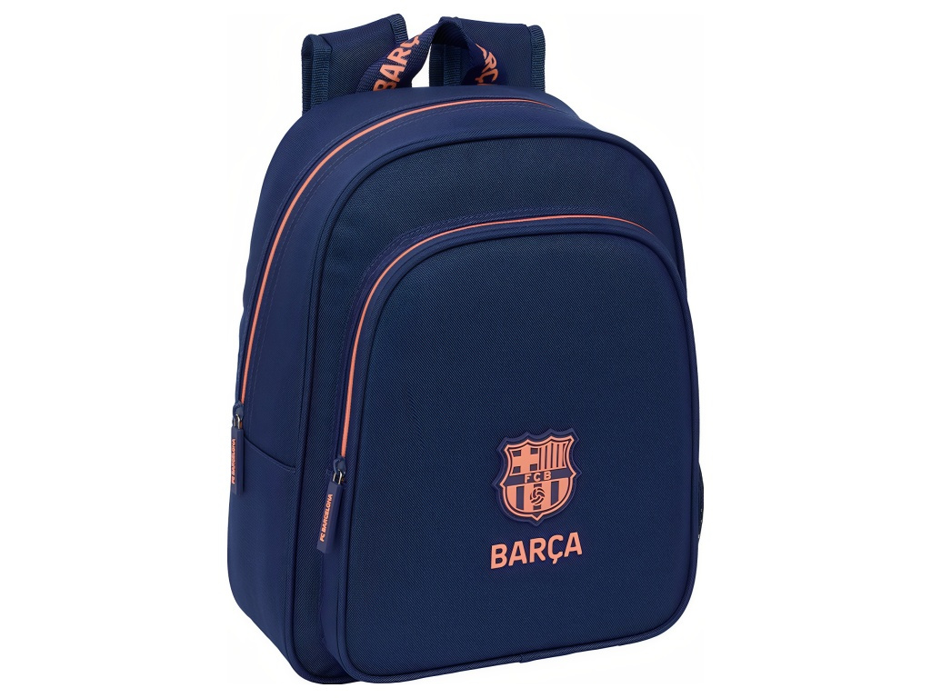 Kompaktní batoh FC Barcelona v tmavě modré barvě s oranžovými detaily a objemem 9 l. Přední stranu zdobí klubový znak a nápis BARÇA. Dvě zipové komory a velká přední kapsa udrží věci přehledně oddělené. Na boku je síťka na láhev. Polstrované, nastavitelné popruhy a horní ucho usnadní nošení. Na zádech je jmenovka proti záměně.