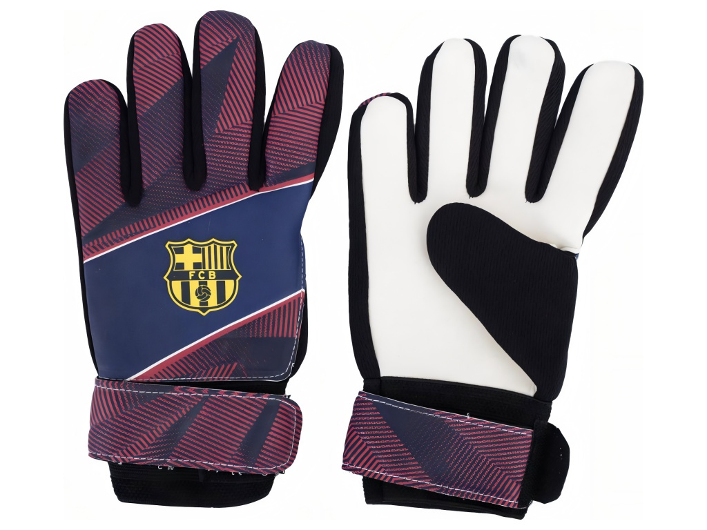 Brankářské rukavice FC Barcelona ve vínovo-modré barvě. Vyrobeny z latexu a polyuretanu. Malý žlutý znak klubu. Nastavitelné zápěstí. Pro dětskou šířku dlaně cca 79-86 mm.
