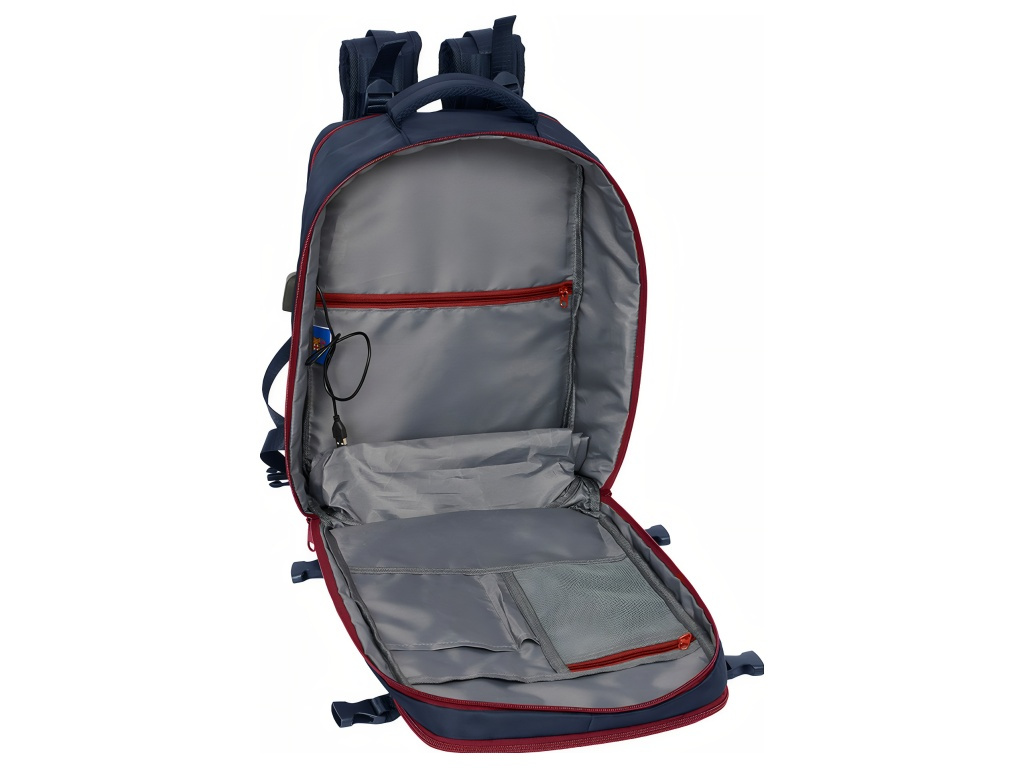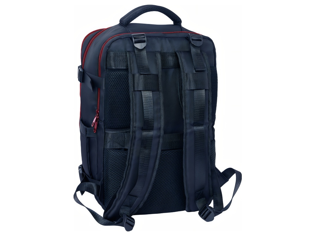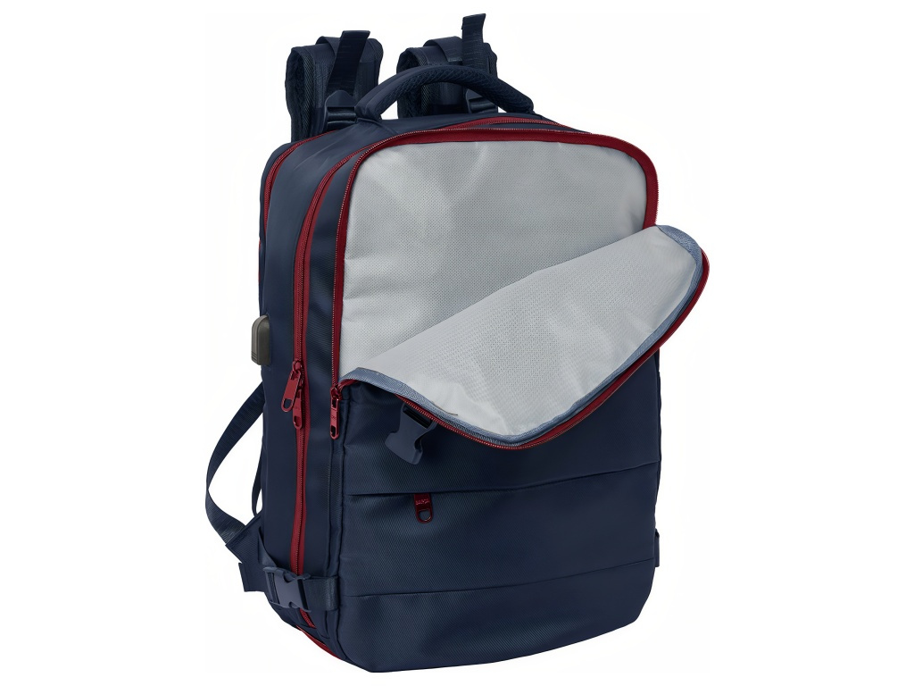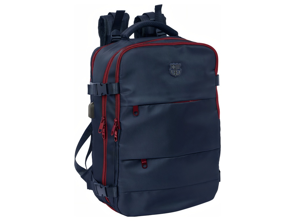 Cestovní kabinový batoh FC Barcelona v tmavě modrém provedení se znakem klubu na přední straně. Přední stranu zdobí znak FC Barcelona. Batoh má 3 oddíly na zip. Hlavní oddíl je prostorný pro oblečení a větší věci. Druhý oddíl má vnitřní organizér a síťovanou kapsu na zip. Třetí oddíl chrání polstrovaná přihrádka pro notebook 15,6". Na boku je kapsa na láhev. Ve spodní části je zipová přihrádka na obuv nebo prádlo. Hlavní oddíly mají dvojité jezdce pro snadné otevírání. Na boku je USB port pro nabíjení na cestách. Vnitřek je kompletně podšitý a polstrovaný. Polstrované ramenní popruhy zvyšují pohodlí při nošení. Zadní panel má prodyšnou síťovinu. Na zadní straně je popruh na kufr. Postranní kompresní popruhy udrží kompaktní tvar. Hlavní oddíly lze otevřít téměř do 180°. Zipy mají prodloužená táhla. Horní madlo je polstrované. Rozměry batohu jsou 29 × 19 × 44 cm. Objem je 23,1 l. Hodí se do kabiny letadla i na pracovní cesty.