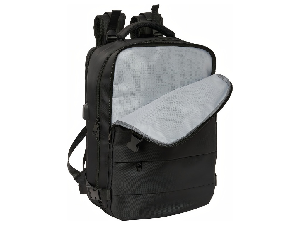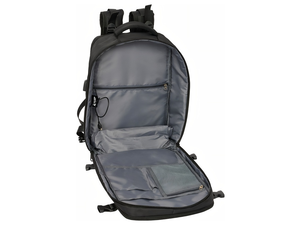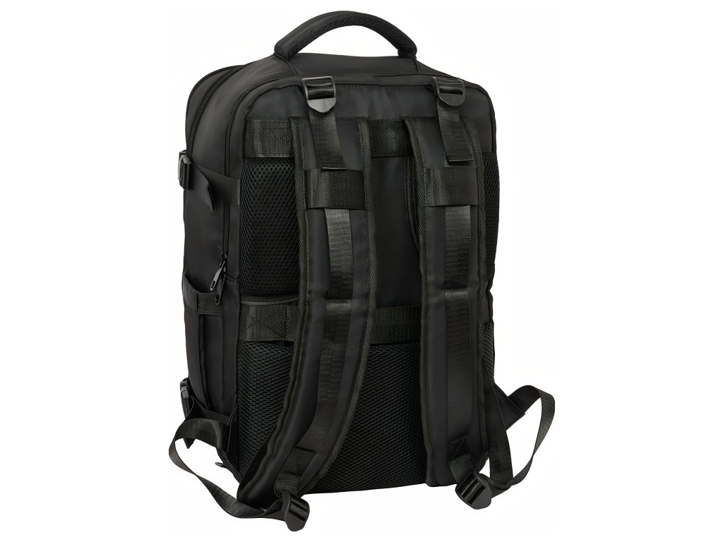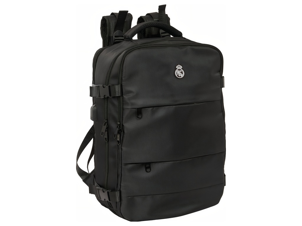 Cestovní kabinový batoh Real Madrid FC v černé barvě s přihrádkou na notebook 15,6″ a spodní komorou na obuv. Minimalistický černý design působí elegantně. Přední stranu zdobí decentní znak Real Madrid FC. Na čele jsou dvě zipové kapsy na příslušenství a drobnosti. Po straně je kapsa na láhev. Batoh má spodní přihrádku na obuv. Přístup je zepředu přes zip. Batoh má 2 hlavní oddíly na zip. Oba hlavní oddíly mají dvojité jezdce. Hlavní oddíly lze otevřít téměř do 180°. Vnitřek je kompletně podšitý a polstrovaný. Jedna část má vnitřní organizér a síťovanou kapsu na zip. Druhá část ukrývá polstrovanou přihrádku na notebook 15,6″. Na boku je USB port pro nabíjení na cestách. Port je chráněný krytem. Rozměr batohu je 29 × 19 × 44 cm. Objem je 23,1 l. Batoh má polstrované ramenní popruhy. Prodyšná síťovina zvyšuje komfort při nošení. Záda jsou polstrovaná. Záda kryje prodyšná síťovina. Na zadní straně je popruh pro upevnění k madlu kufru. Postranní kompresní popruhy drží kompaktní tvar batohu. Přezky jsou z PVC. Zipy mají prodloužená táhla pro snadné otevírání. Horní madlo je polstrované.