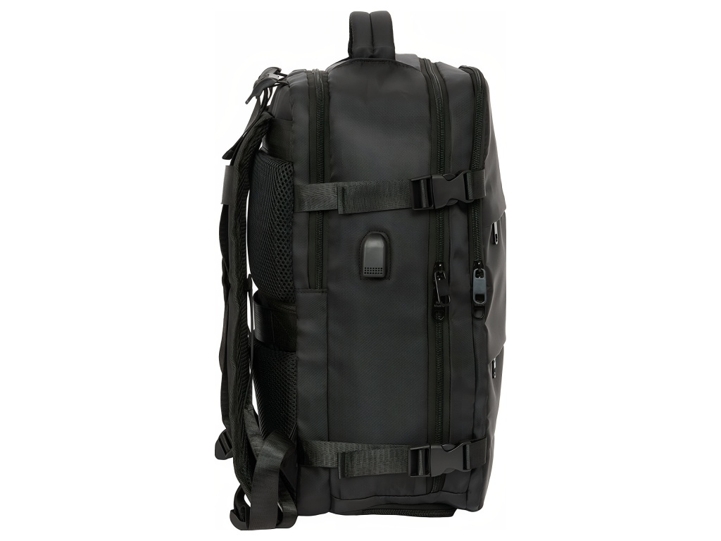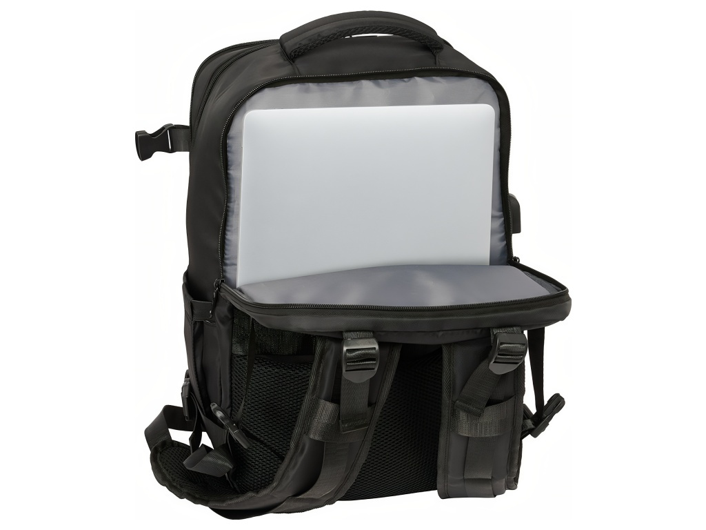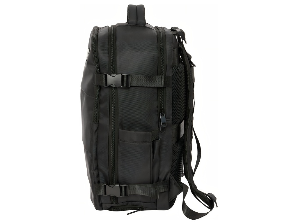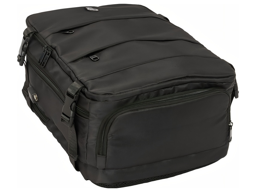 Cestovní kabinový batoh Real Madrid FC v černé barvě s přihrádkou na notebook 15,6″ a spodní komorou na obuv. Minimalistický černý design působí elegantně. Přední stranu zdobí decentní znak Real Madrid FC. Na čele jsou dvě zipové kapsy na příslušenství a drobnosti. Po straně je kapsa na láhev. Batoh má spodní přihrádku na obuv. Přístup je zepředu přes zip. Batoh má 2 hlavní oddíly na zip. Oba hlavní oddíly mají dvojité jezdce. Hlavní oddíly lze otevřít téměř do 180°. Vnitřek je kompletně podšitý a polstrovaný. Jedna část má vnitřní organizér a síťovanou kapsu na zip. Druhá část ukrývá polstrovanou přihrádku na notebook 15,6″. Na boku je USB port pro nabíjení na cestách. Port je chráněný krytem. Rozměr batohu je 29 × 19 × 44 cm. Objem je 23,1 l. Batoh má polstrované ramenní popruhy. Prodyšná síťovina zvyšuje komfort při nošení. Záda jsou polstrovaná. Záda kryje prodyšná síťovina. Na zadní straně je popruh pro upevnění k madlu kufru. Postranní kompresní popruhy drží kompaktní tvar batohu. Přezky jsou z PVC. Zipy mají prodloužená táhla pro snadné otevírání. Horní madlo je polstrované.