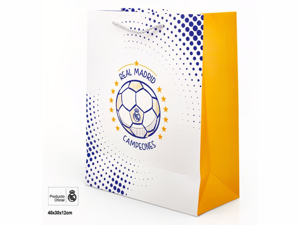 Dárková papírová taška Real Madrid FC v bílé barvě se znakem klubu. Bílá barva nechá vyniknout klubový motiv. Přední stranu zdobí znak Real Madrid FC. Taška má jeden hlavní prostor pro uložení dárku. Ucha tašky jsou z provázku. Dobře se drží v ruce. Rozměr je 30 × 40 × 12 cm. Velikost pojme oblečení, knihy i drobnější předměty. Taška je vyrobena z kvalitního papíru. Tašku lze použít opakovaně. Doporučeno skladovat v suchu a chránit před vlhkostí. Hodí se pro balení dárků pro fanoušky klubu i pro klubové akce.