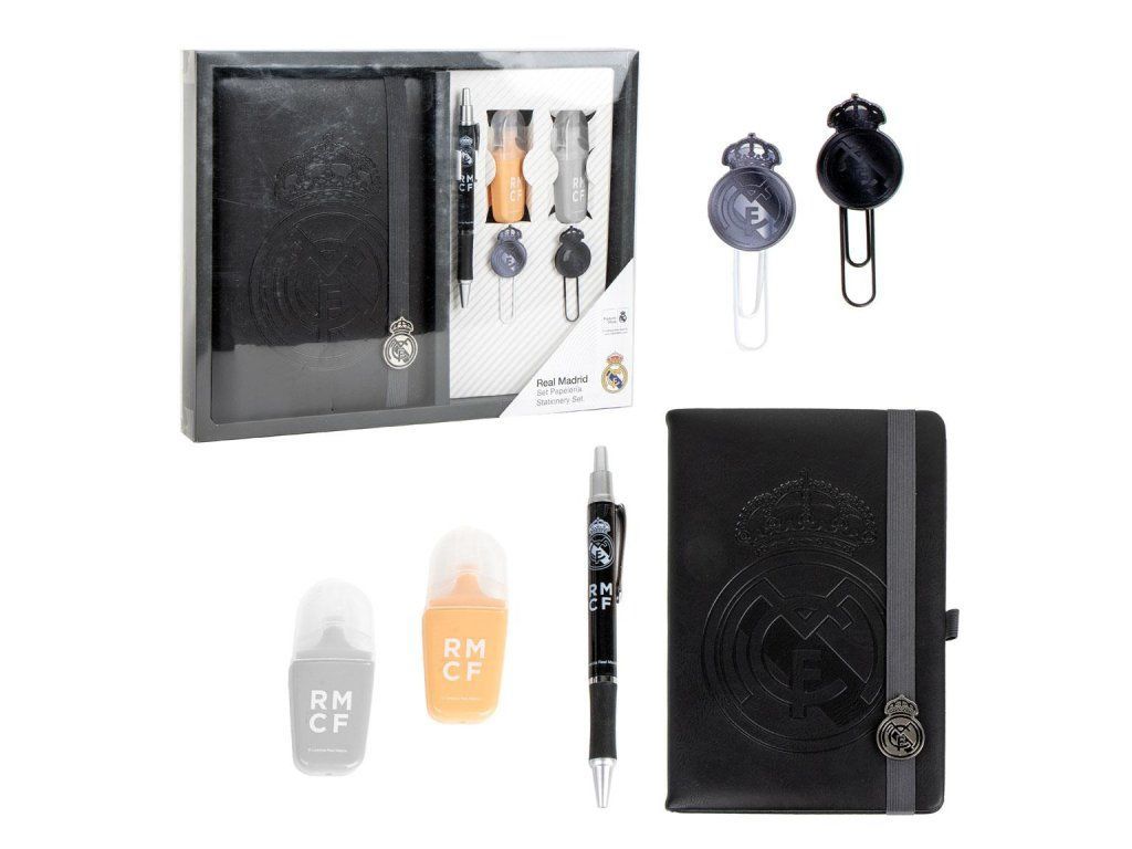 Dárková sada šesti psacích potřeb Real Madrid v elegantním černém provedení. Zápisník formátu A5 s obálkou z PU kůže zaujme velkým reliéfním znakem klubu a kovovým znakem na elastické uzávěrce. Součástí je kuličkové pero, dva mini zvýrazňovače v oranžové a šedé barvě a dvě ozdobné kancelářské sponky se znakem klubu. Celá sada přichází v dárkové krabičce s průhledným víkem, takže ji stačí rovnou darovat.