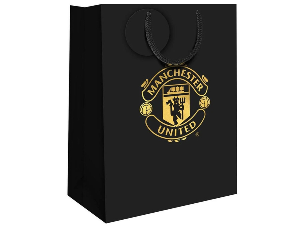 Dárková taška Manchester United v černé barvě se zlatým znakem a tkanými uchy pro pohodlné nošení. Minimalistický vzhled působí elegantně a reprezentativně. Uprostřed přední strany vyniká velký zlatý znak klubu, který dodá dárku slavnostní tón. Otevřený vstup urychlí balení a uvnitř je volný prostor bez kapes. Taška je z pevného papíru (kartonu), dobře drží tvar a zvládne běžné klubové dárky střední velikosti, přibližně 33 × 26 cm. Tkané šňůrky jsou příjemné do ruky a jedna nese kulatý dárkový štítek pro věnování.