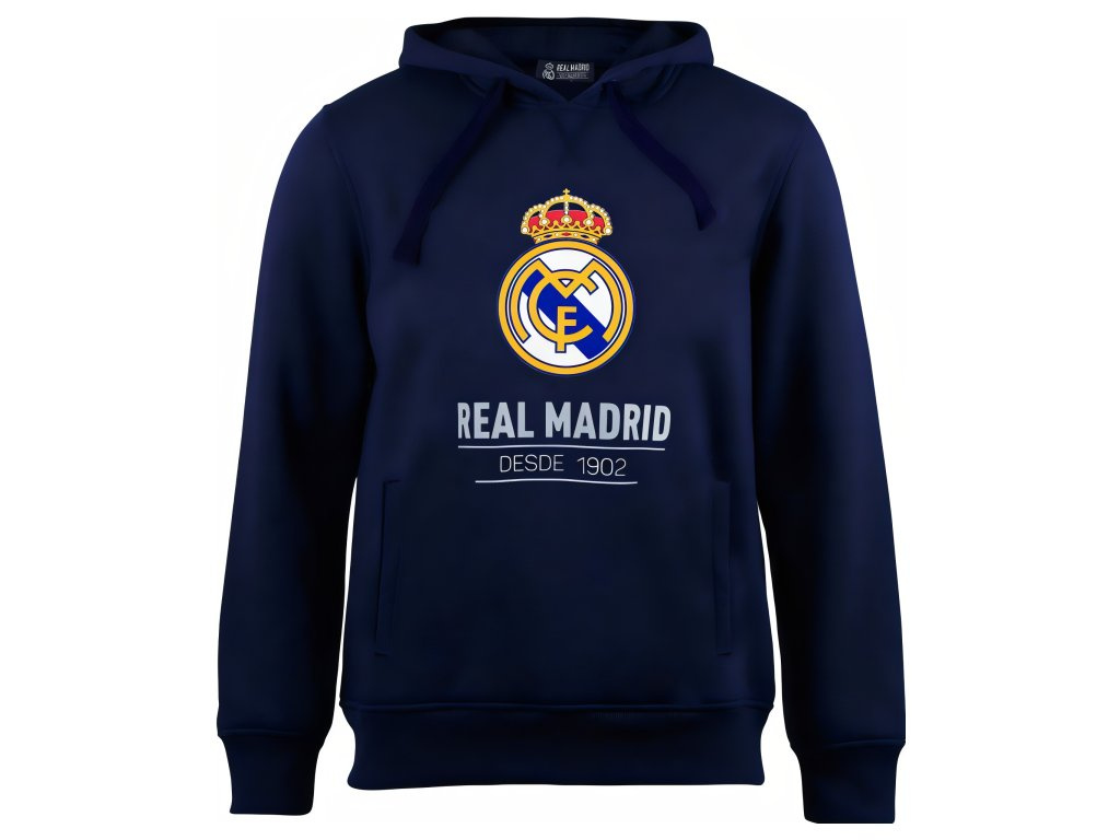 Dětská mikina Real Madrid FC v tmavě modré barvě s kapucí. Mikinu zdobí výrazný barevný znak Real Madrid FC a nápis Real Madrid 1902. Oblékání přes hlavu, klokaní kapsa vpředu. Elastické manžety a pas pro pohodlné nošení. Mikina je z příjemného materiálu s vyšším podílem bavlny pro měkkost a hřejivost.
