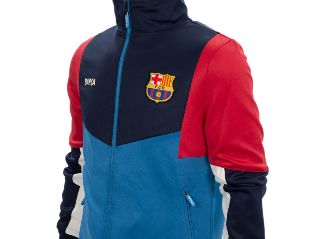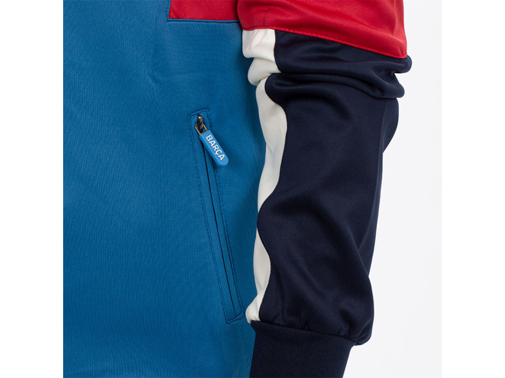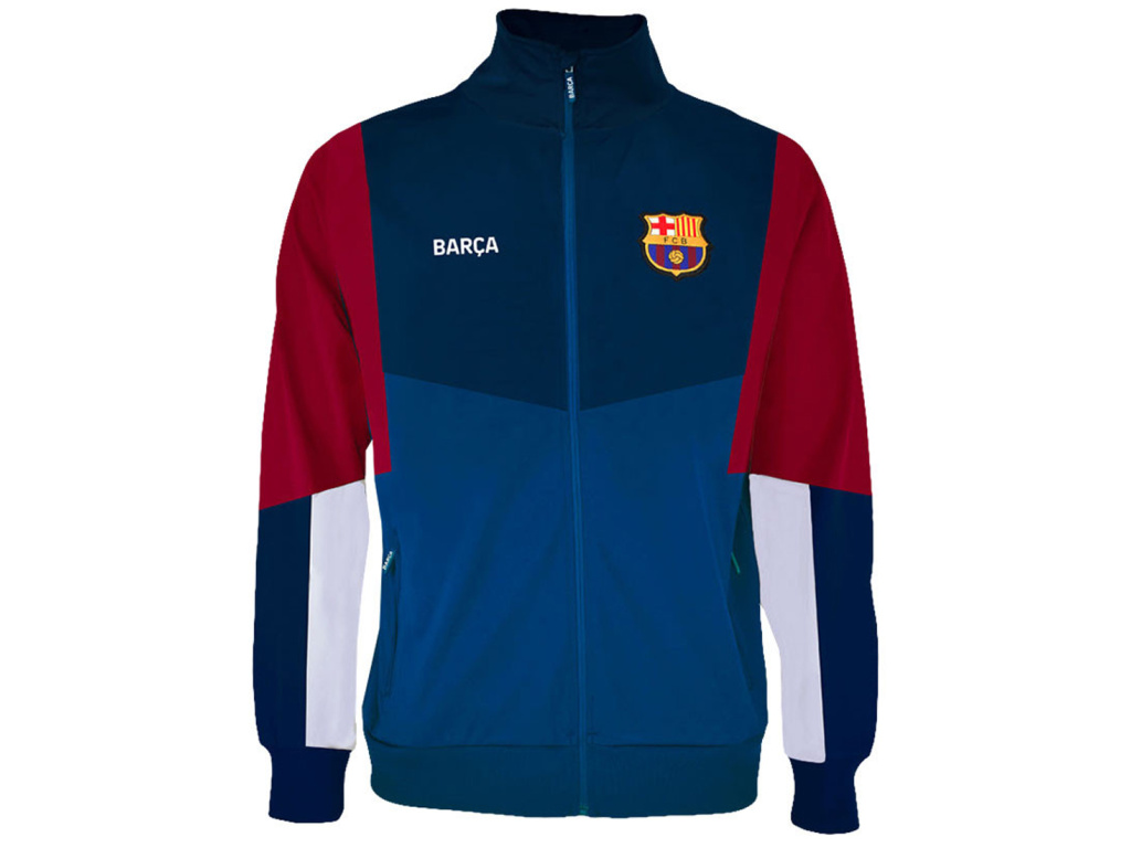 Dětská sportovní bunda FC Barcelona v modré a vínové barvě s bílým pruhem na rukávu. Barevný znak klubu FCB na levé straně hrudi. Bílý nápis BARCA na pravé straně. Dvě kapsy na bocích s pohodlným zapínáním na zip. Stojáček u krku chrání krk před chladem. Celá bunda se zapíná na zip. Polyesterový materiál zajišťuje vysokou odolnost a komfort nošení.