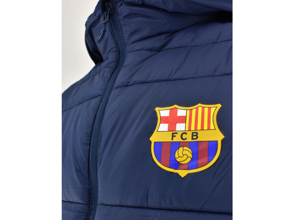 Dětská zimní bunda FC Barcelona v tmavě modré barvě s kapucí a zipem. Prošívaná konstrukce s hřejivou výplní udrží teplo v chladných dnech. Boční kapsy na zip bezpečně schovají drobnosti i ruce. Na levé hrudi je klubový znak provedený jako potisk. Jzdce zipů nesou nenápadný nápis BARÇA. Materiál je 100 % polyester.