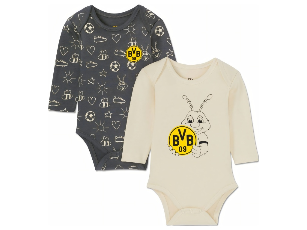Sada 2 dětských body Borussia Dortmund s dlouhým rukávem ve velikosti 62/68. Materiál 100% bavlna je hebký k dětské pokožce. Praktické druky v rozkroku urychlí přebalování. Překládaný výstřih usnadní oblékání přes hlavu. Jeden kus je tmavě šedý s celopotiskem a klubovým znakem, druhý krémový s kreslenou včelkou držící znak BVB. Dva kusy v balení se hodí na střídání mezi praním.