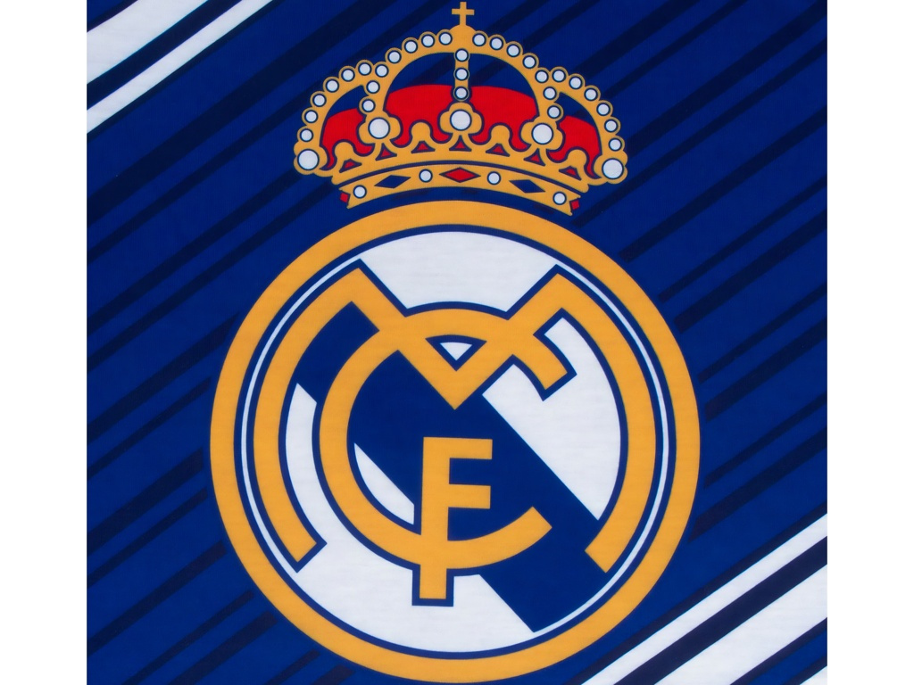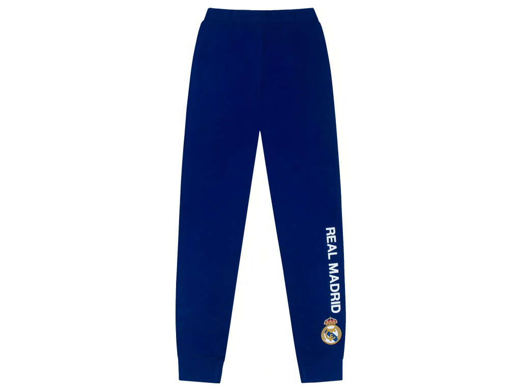 Dětské pyžamo Real Madrid v tmavě modré barvě s dlouhým rukávem a kalhotami je připravené na klidný spánek malých fanoušků. Přední díl trika zdobí velký klubový znak a šikmé pruhy. Triko má kulatý výstřih a manžety na rukávech. Kalhoty drží na elastickém pasu, u kotníků mají lemy. Na nohavici je nápis REAL MADRID a menší klubový znak. Příjemná kombinace bavlny a polyesteru je měkká na dotek.