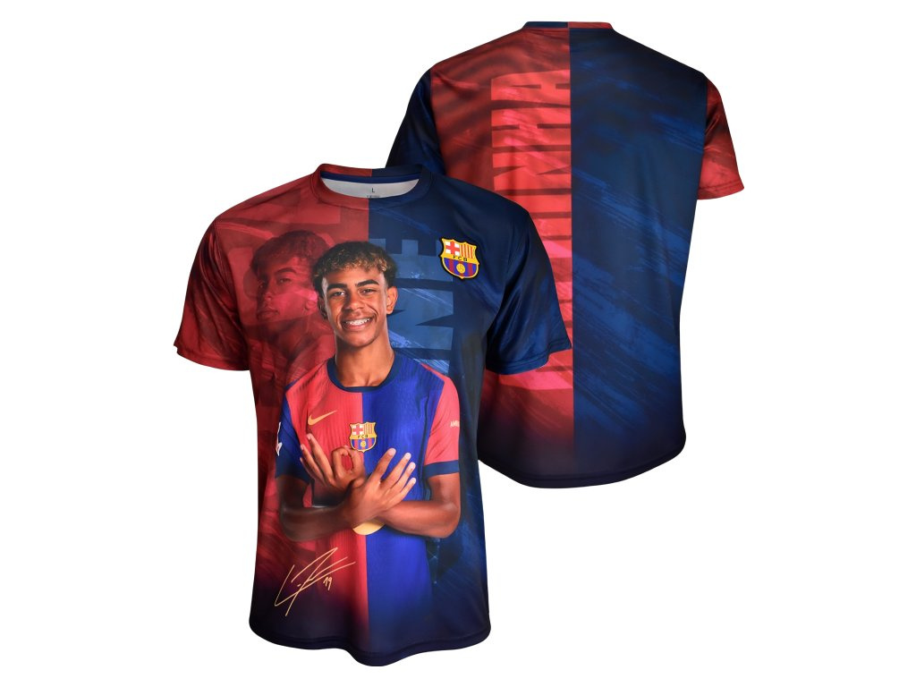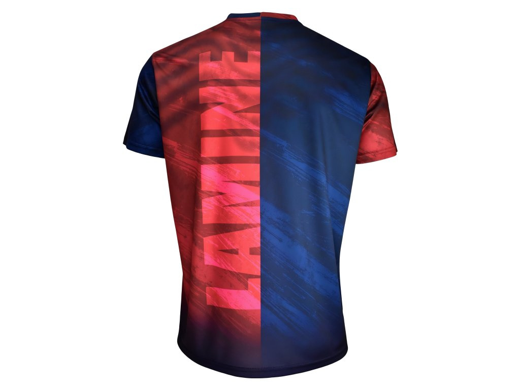 Dětské tričko FC Barcelona s motivem Lamine Yamala v modročervené kombinaci. Krátký rukáv a kulatý výstřih se hodí na každý den. Přední strana má výrazný foto potisk se znakem klubu na hrudi. Na zádech je velký nápis LAMINE. Materiál 100 % polyester je lehký, prodyšný a rychle schne. Tričko je pohodlné na fandění, do školy i na hřiště.