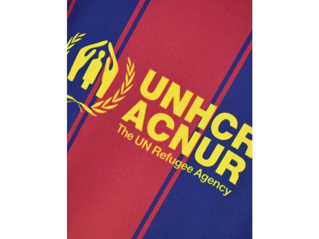 Dětský domácí set FC Barcelona 25/26 – oficiální replika zahrnuje dres a šortky. Modro‑červené svislé pruhy odkazují na klubové barvy. Na hrudi je klubový znak a značka Spotify, na zádech motiv UNHCR/ACNUR. Dres má krátké rukávy a kulatý výstřih, u límce jsou katalánské pruhy. Materiál je lehký a prodyšný polyester, který rychle schne a snadno se udržuje.