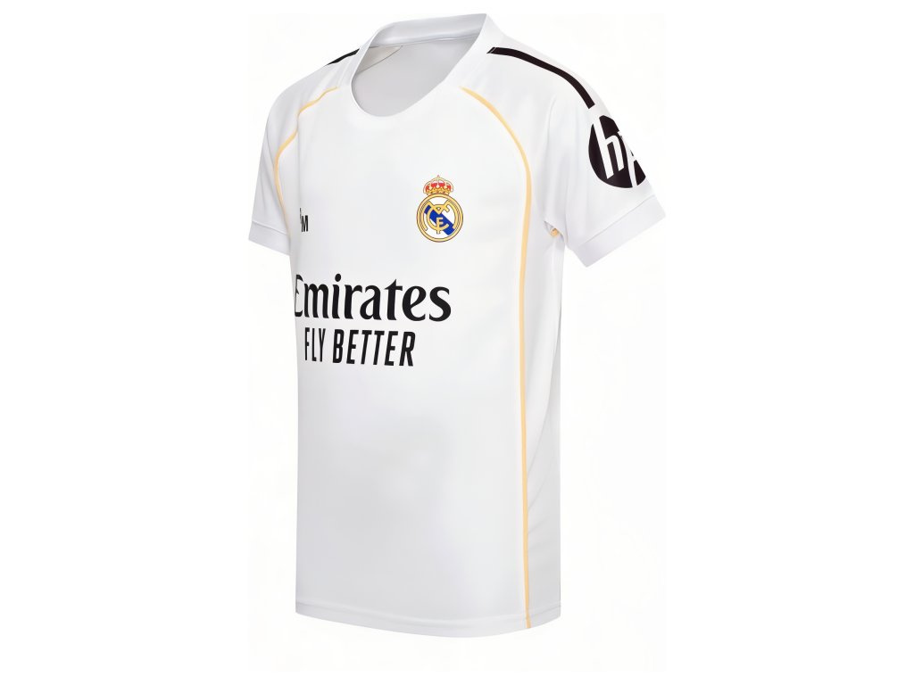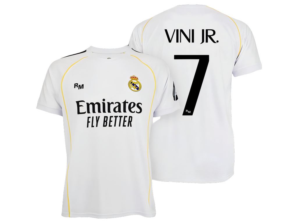 Dětský domácí set Real Madrid 25/26 s potiskem VINI JR. 7 je replika dresu se šortkami pro malé fanoušky. Bílá základní barva s černými a žlutými detaily a klubovní znak na hrudi působí věrně. Na zádech je jméno a číslo VINI JR. 7. 100% polyester je lehký, prodyšný a rychle schne. Raglánové rukávy neomezují pohyb při hře. Šortky mají elastický pas. Souprava obsahuje dres a šortky. Dres je připraven na trénink i fandění.