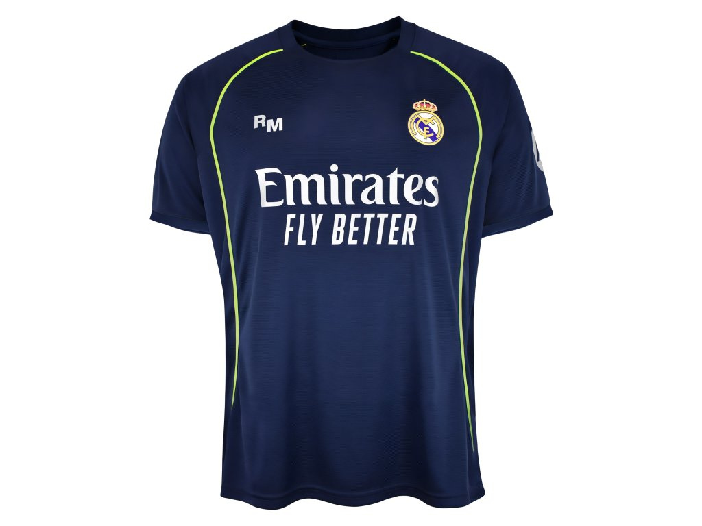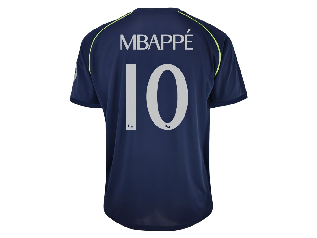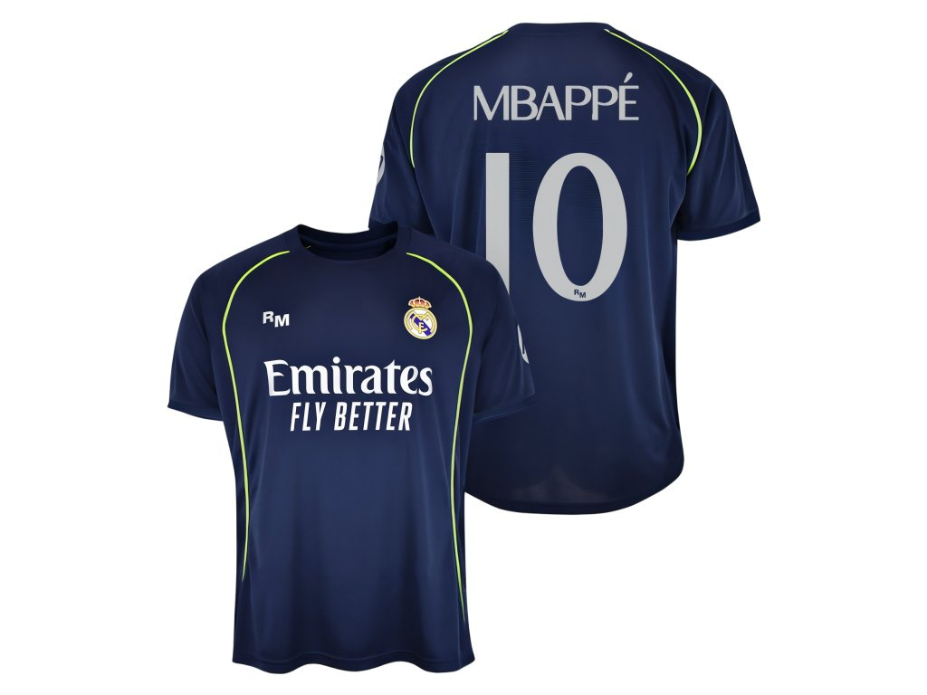 Pánský dres Real Madrid 25/26 Away s potiskem Mbappé 10, replika. Tmavě modrá základní barva s limetkovými liniemi podél ramen a boků. Lehký a prodyšný polyester pro pohodlí po celý den. Standardní střih a raglánové rukávy neomezují v pohybu. Na hrudi je klubový znak a sponzorský nápis. Kulatý výstřih a lehce zaoblený spodní lem dobře sedí.