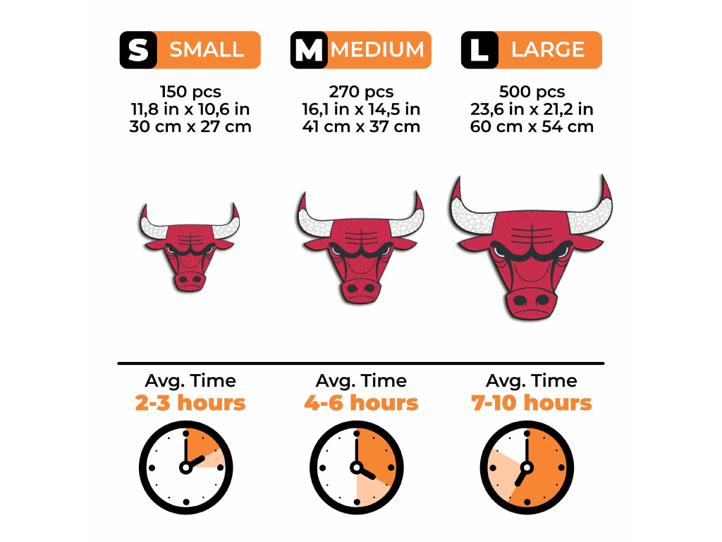 Dřevěné puzzle Chicago Bulls v designu znaku klubu. Počet dílků 150 ks. Rozměr 30 × 27 cm. Precizně zpracované puzzle ve tvaru klubového erbu. Motivem je slavné logo Chicago Bulls v sytě červené a černé barvě, odpovídající originálním klubovým barvám. Některé dílky mají unikátní tvar inspirovaný basketbalem a klubem. Najdeš siluety hráčů, míčů, různých pozic a akcí ze hřiště. Puzzle jsou vyrobeny z masivního FSC certifikovaného dřeva. Dílky jsou až 3× silnější než běžné kartonové puzzle. Povrch je hladký a skládání je příjemné na dotek. Součástí je elegantní dřevěná dárková krabička, skvělá i jako dekorativní předmět. Puzzle můžeš nalepit na podložku a pověsit na zeď jako originální dekoraci.