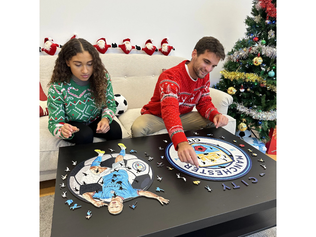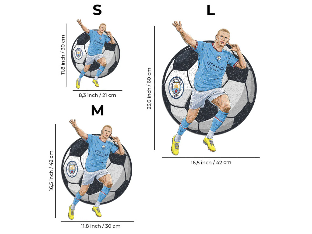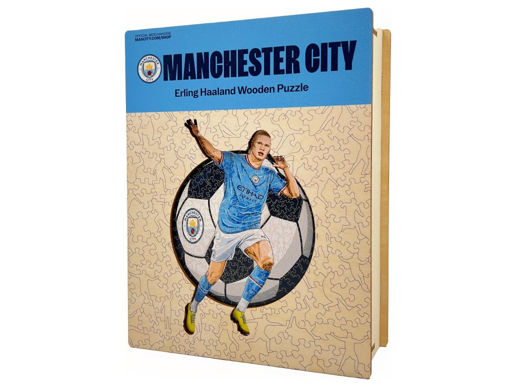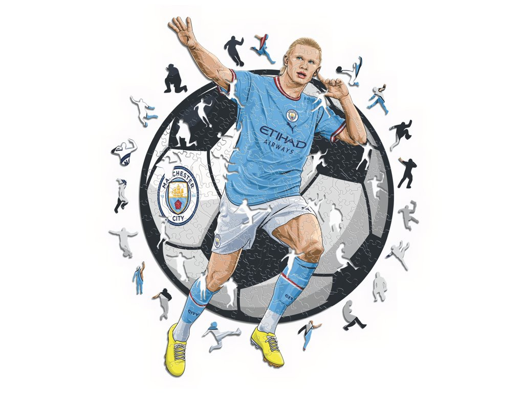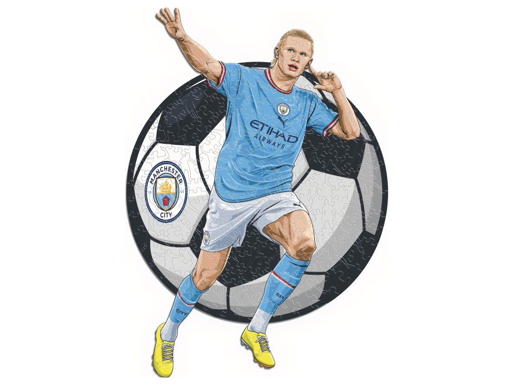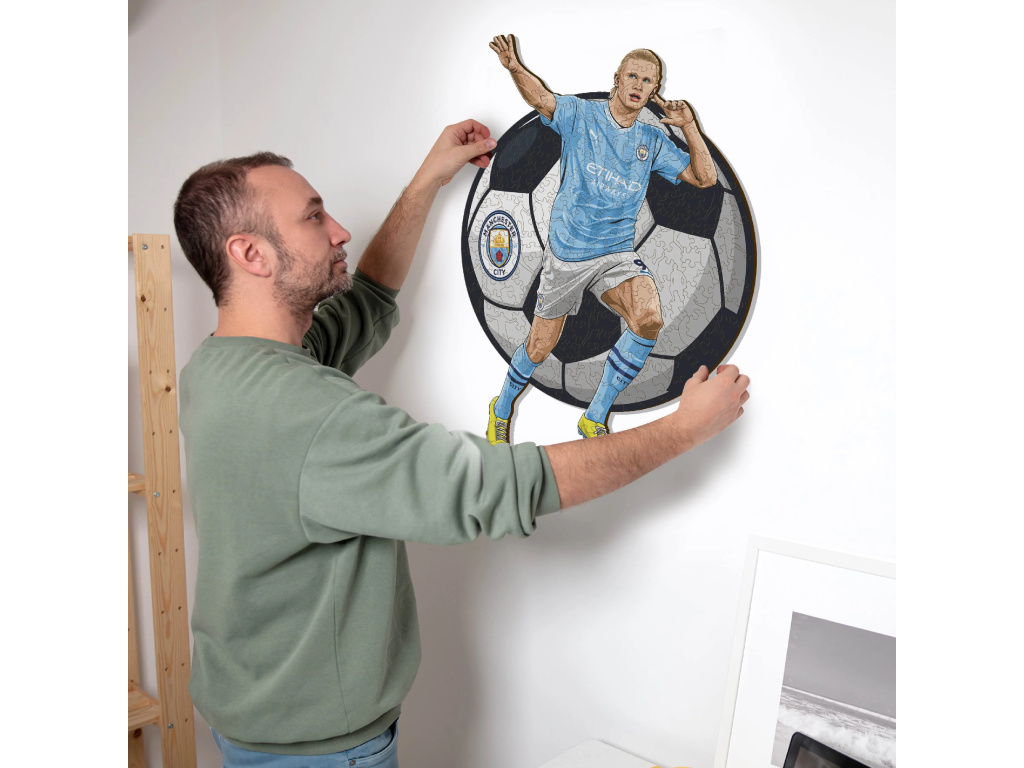 Dřevěné puzzle Erling Haaland v dresu Manchester City FC. Počet dílků 270 ks. Rozměr 42×30 cm. Precizně zpracované puzzle s vyobrazením slavného hráče. Dominuje portrét Erlinga Haalanda v klubových modrých barvách Manchesteru City, které skvěle vynikají na pozadí. Některé dílky mají unikátní tvar inspirovaný fotbalem. Mezi dílky najdeš siluety hráčů, míčů, různých pozic a akcí na hřišti. Puzzle jsou vyrobeny z masivního FSC certifikovaného dřeva. Dílky jsou až 3× silnější než běžné kartonové puzzle. Povrch je hladký a skládání je příjemné na dotek. Součástí je elegantní dřevěná dárková krabička, skvělá i jako dekorativní předmět. Puzzle lze nalepit na podložku a pověsit na zeď jako originální dekoraci.