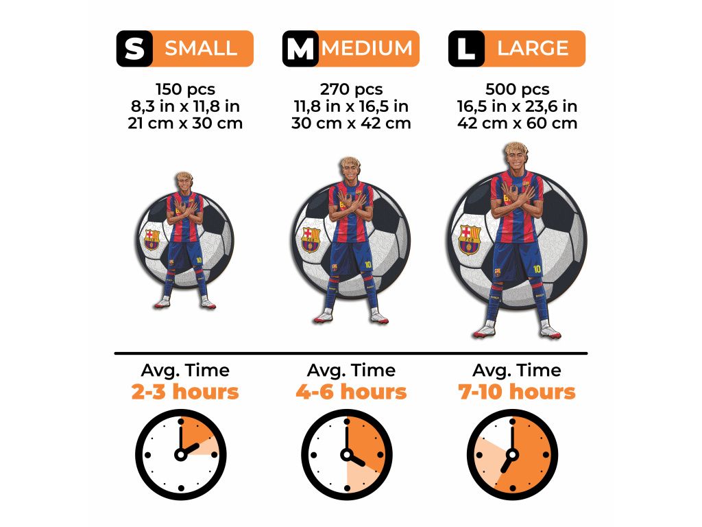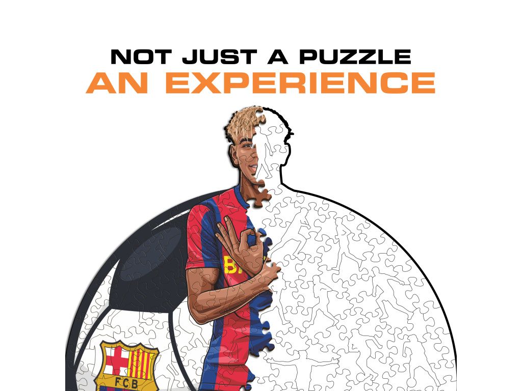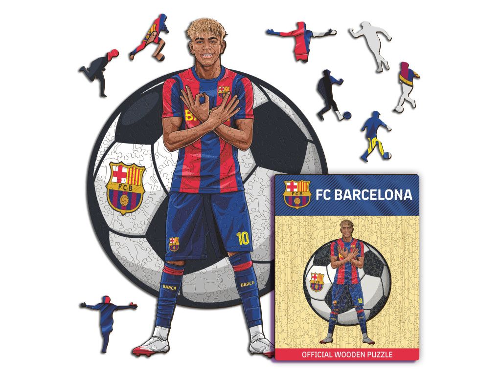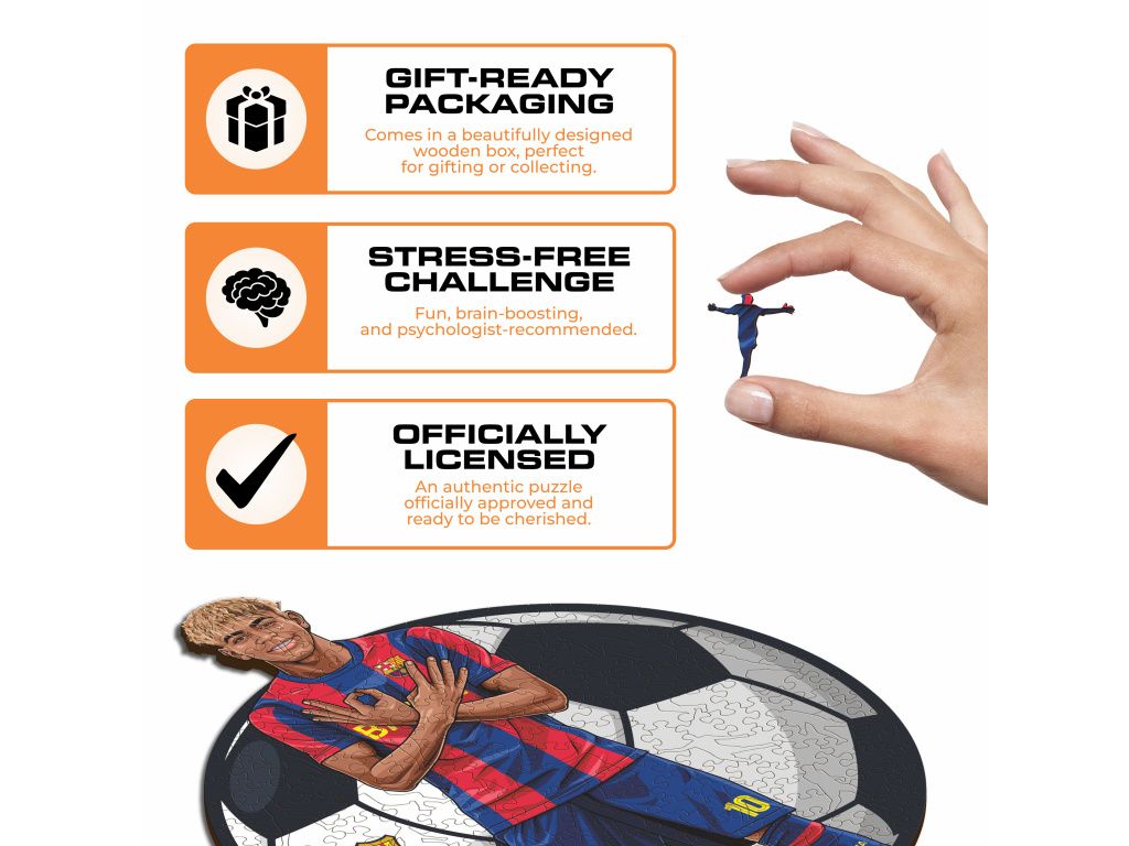 Dřevěné puzzle Lamine Yamal v dresu FC Barcelona. Počet dílků 500 ks. Rozměr 60 × 42 cm. Precizně zpracované puzzle s vyobrazením slavného hráče. Na fotografiích dominuje ikonický portrét mladé hvězdy Lamine Yamala v tradičních barvách Barcelony. Barvy jsou věrné originálu. Některé dílky mají unikátní tvar inspirovaný fotbalem. Mezi dílky najdeš siluety hráčů, míčů, různých pozic a akcí na hřišti. Puzzle jsou vyrobeny z masivního FSC certifikovaného dřeva. Dílky jsou až 3× silnější než běžné kartonové puzzle. Povrch je hladký a skládání je příjemné na dotek. Součástí je elegantní dřevěná dárková krabička, skvělá i jako dekorativní předmět.