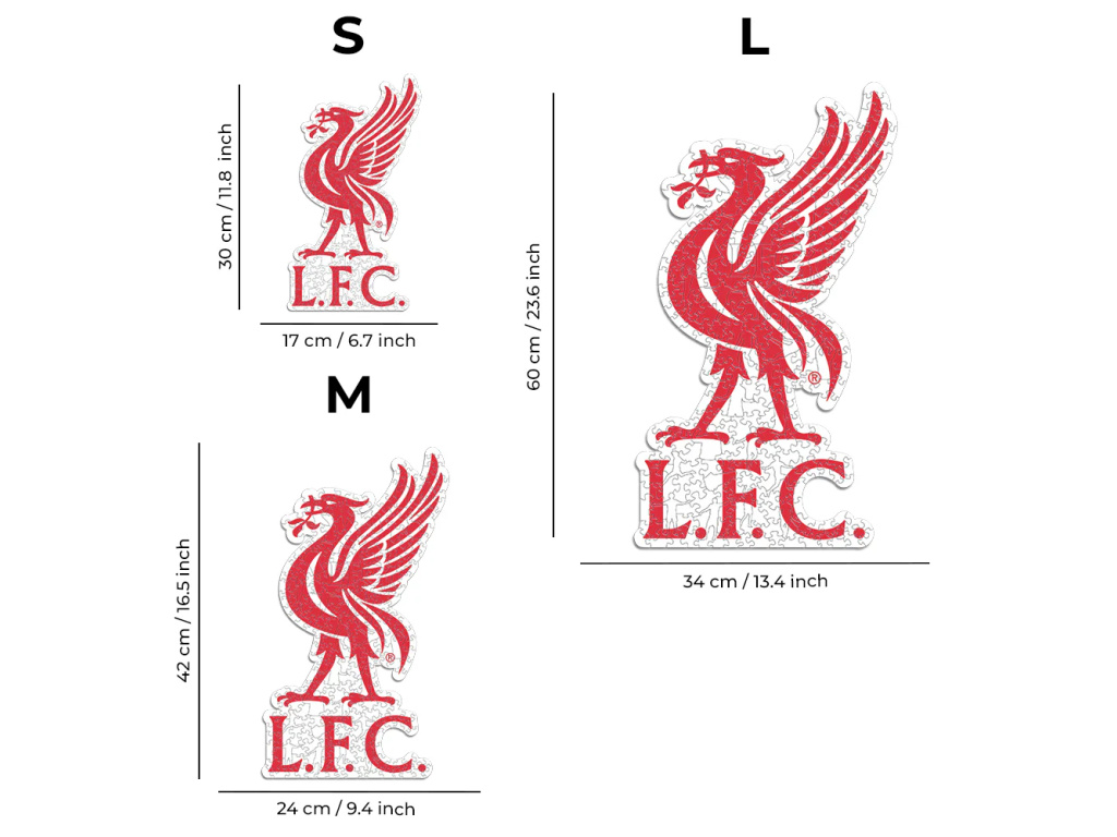 Dřevěné puzzle Liverpool FC v designu Liver Bird. Počet dílků 270 ks. Rozměr 24 × 42 cm. Precizně zpracované puzzle ve tvaru ikonického klubového symbolu Liver Bird. Výrazná sytě červená barva, jemné ohraničení a výrazná textura dřeva. Barvy jsou věrné originálu. Některé dílky mají unikátní tvar inspirovaný fotbalem. Najdeš mezi nimi siluety hráčů, míčů i trofejí. Puzzle jsou vyrobeny z masivního FSC certifikovaného dřeva. Dílky jsou až 3× silnější než běžné kartonové puzzle. Povrch je hladký a skládání je příjemné na dotek. Součástí je elegantní dřevěná dárková krabička, která vypadá skvěle i jako dekorace. Puzzle lze nalepit a pověsit na zeď jako originální dekoraci.