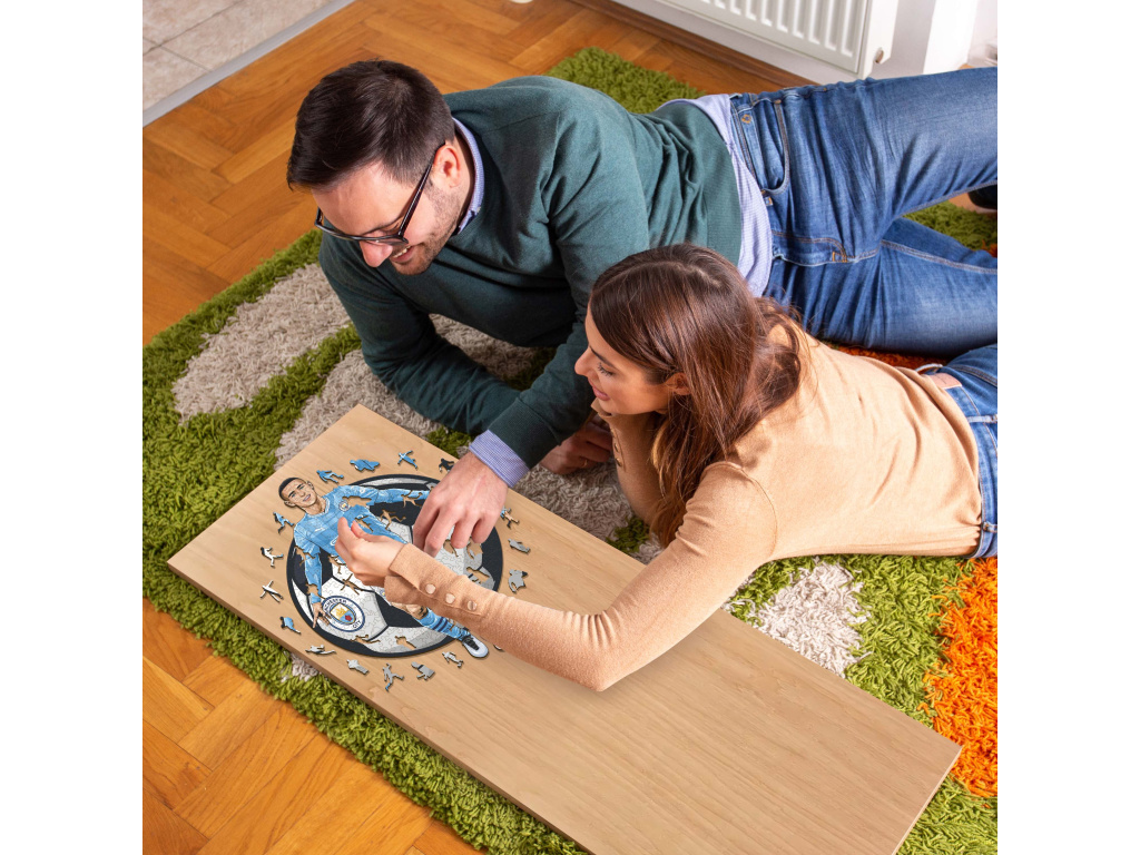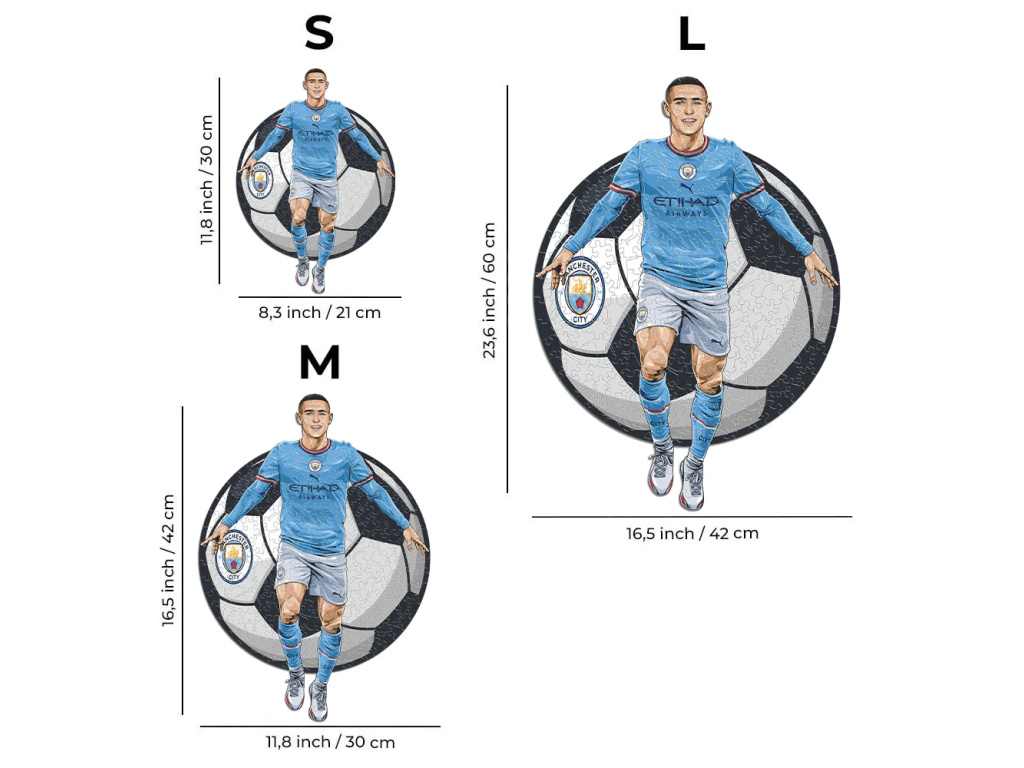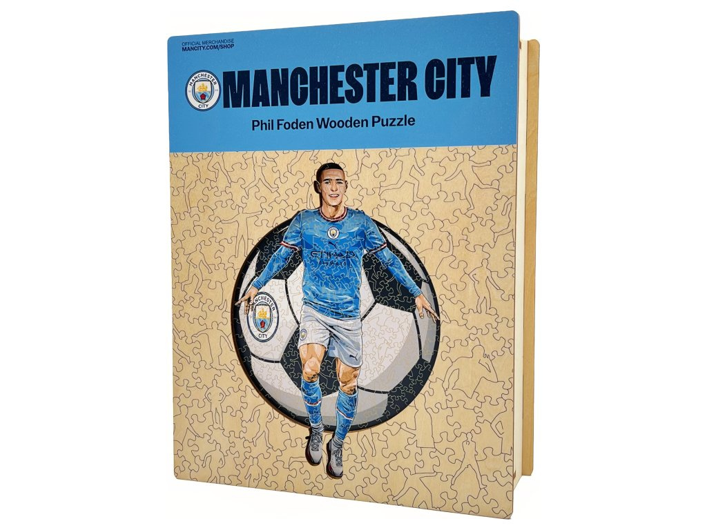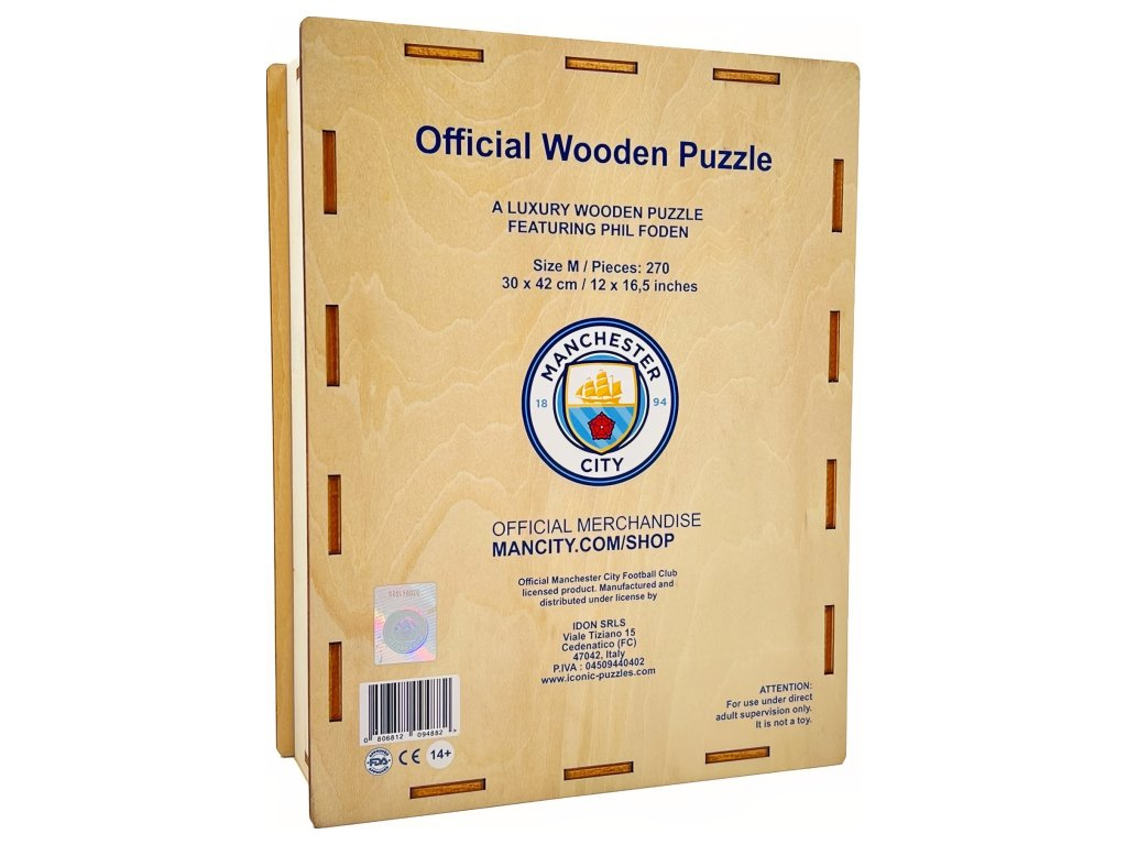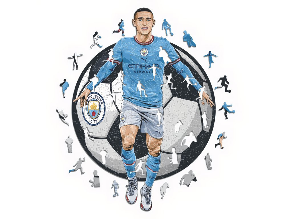 Dřevěné puzzle Phil Foden v dresu Manchester City FC. Počet dílků 150 ks. Rozměr 30 × 21 cm. Precizně zpracované puzzle s vyobrazením slavného hráče v typickém světle modrém dresu Manchester City. Dominují světle modré barvy s klubovými detaily a realistickým ztvárněním hráče. Některé dílky mají unikátní tvar inspirovaný fotbalem. Mezi dílky najdeš siluety hráčů, míčů a různých fotbalových akcí. Puzzle jsou vyrobeny z masivního FSC certifikovaného dřeva. Dílky jsou až 3× silnější než běžné kartonové puzzle. Povrch je hladký a skládání je příjemné na dotek. Součástí je elegantní dřevěná dárková krabička, skvělá i jako dekorativní předmět. Puzzle lze nalepit na podložku a pověsit na zeď jako originální dekoraci.