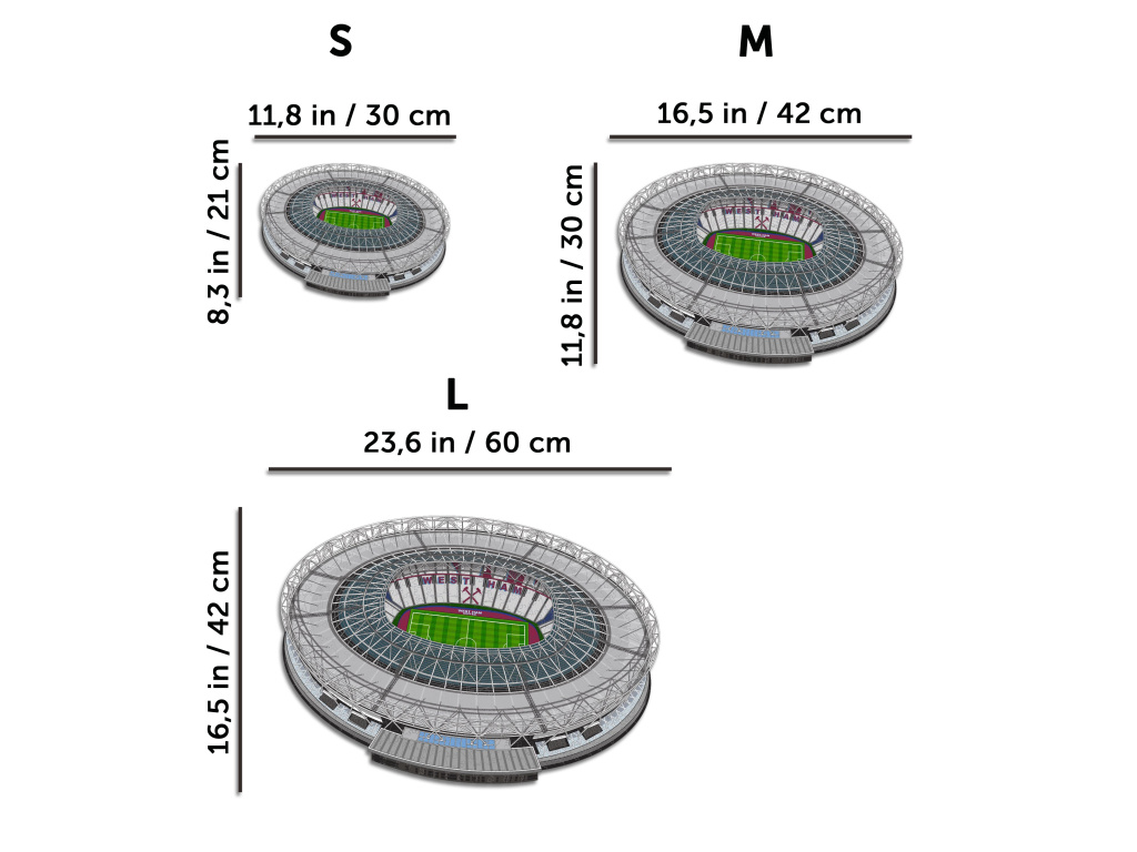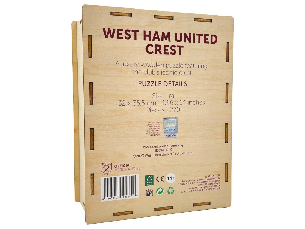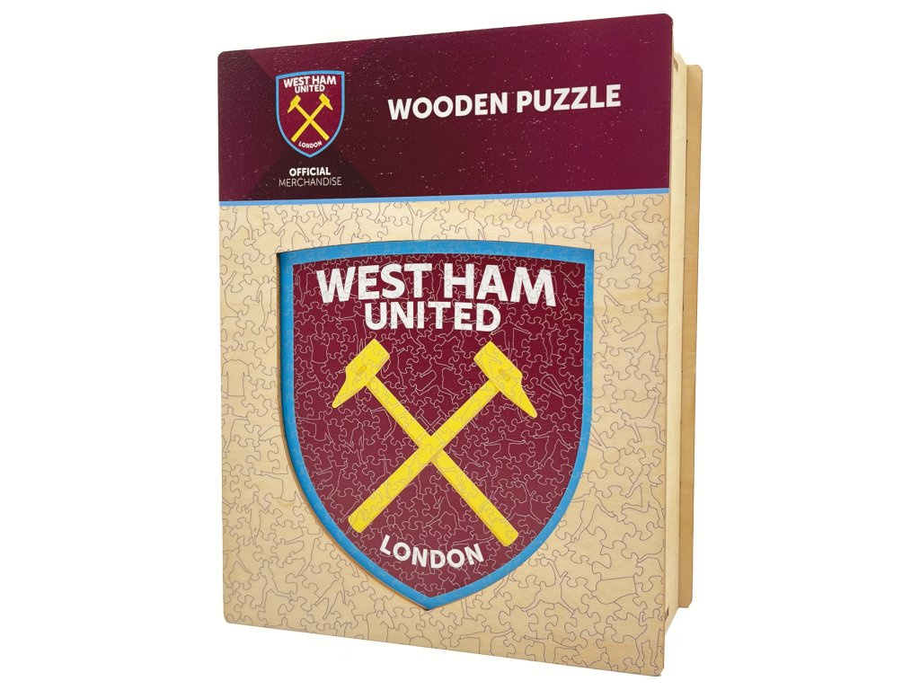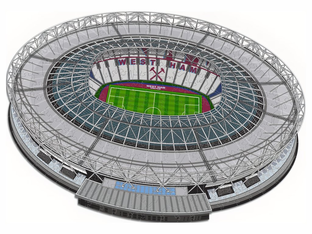 Dřevěné puzzle West Ham United FC v designu stadionu. Počet dílků 500 ks. Rozměr 59 × 42 cm. Precizně zpracované puzzle ve tvaru stadionu klubu. Dominantou je detailní motiv domovského stadionu West Ham United, s charakteristickými klubovými barvami a logem. Některé dílky mají unikátní tvar inspirovaný fotbalem. Mezi dílky najdeš siluety hráčů, míčů a ikonických fotbalových akcí. Puzzle jsou vyrobeny z masivního FSC certifikovaného dřeva. Dílky jsou až 3× silnější než běžné kartonové puzzle. Povrch je hladký a skládání je příjemné na dotek. Součástí je elegantní dřevěná dárková krabička, skvělá i jako dekorativní předmět. Puzzle lze nalepit na podložku a pověsit na zeď jako originální dekoraci.