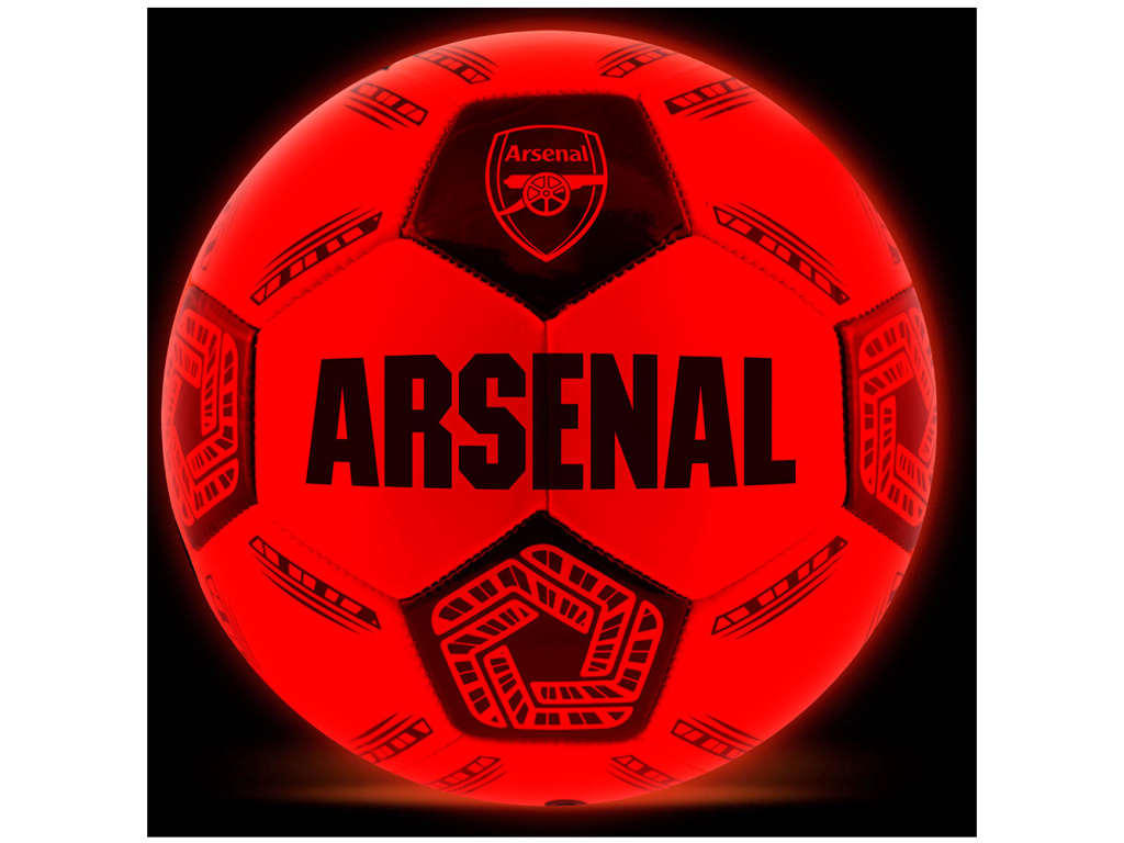 Svítící fotbalový míč Arsenal FC ve velikosti 5 pro rekreační hru za dne i po setmění. Oranžovo‑černé provedení s velkým nápisem ARSENAL a znakem klubu. Po odrazu se aktivuje LED světlo a následně se samo vypne. Výdrž svícení až 30 hodin. Klasická 32 panelová konstrukce pomáhá držet kulatý tvar. Pro optimální odskok nafoukněte na 7,5–8,5 psi (≈ 0,52–0,59 bar). Pro bezpečnou přepravu je míč dodán vyfouknutý; před použitím jej dofoukněte.