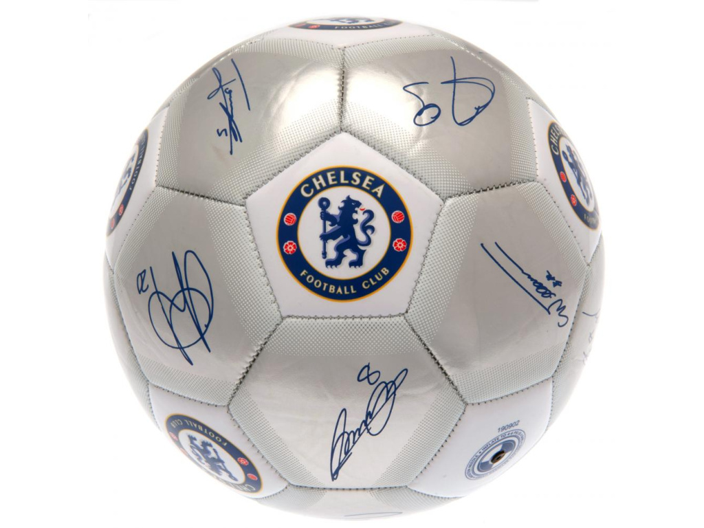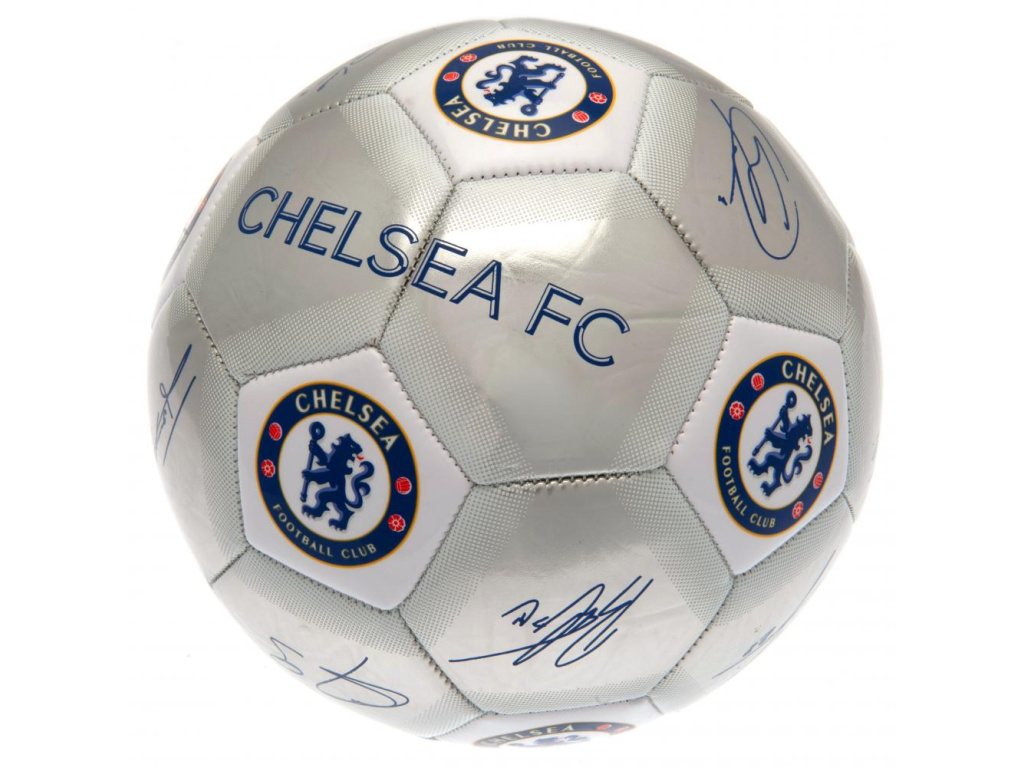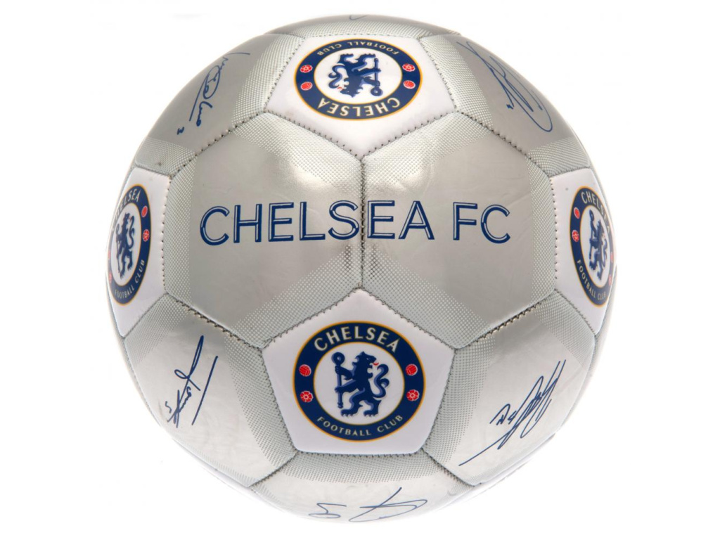 Fotbalový míč Chelsea FC. Vyniká stříbrnou barvou se znakem a nápisem Chelsea FC. Jedinečný design podtrhují otisky podpisů hráčů slavného týmu. Míč má standardní velikost 5. Vyroben z kvalitního PVC materiálu. Složen z 32 panelů. Ideální pro příležitostnou rekreační hru.