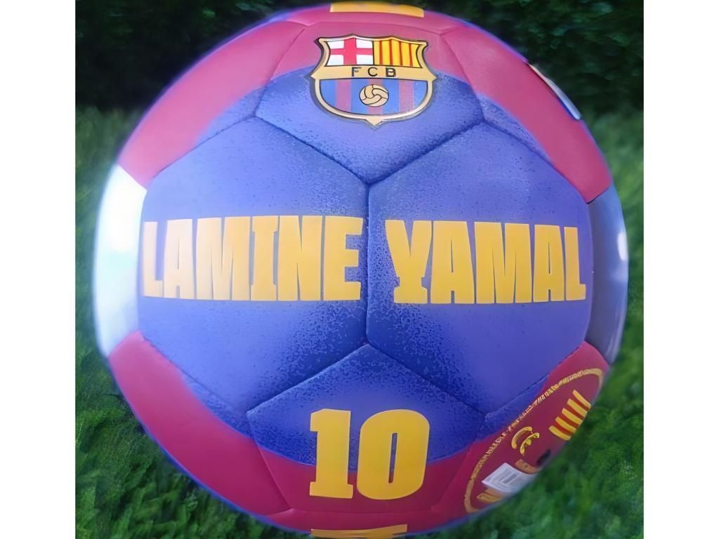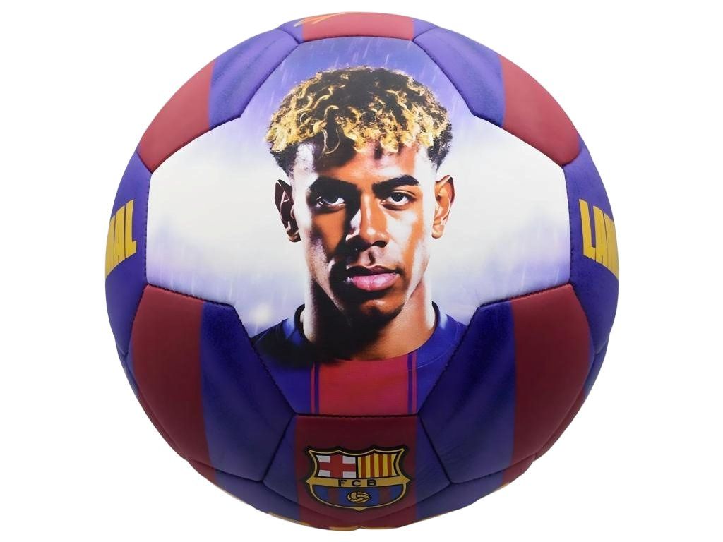 Fotbalový míč FC Barcelona s motivem hráče Lamine Yamal ve velikosti 5. Modro‑vínový design doplňuje výrazný portrét hráče, žluté nápisy LAMINE YAMAL a BARÇA, klubový znak a číslo 10. Díky výrazné grafice je míč dobře vidět při hře na hřišti i na zahradě. Povrch působí hladce a po hře se snadno otírá. Pro bezpečnou přepravu dorazí vyfouknutý a před použitím je potřeba jej dofouknout. Velikost míče 5 vyhovuje mládeži od cca 13 let i dospělým. Míč je určen pro rekreační hru.