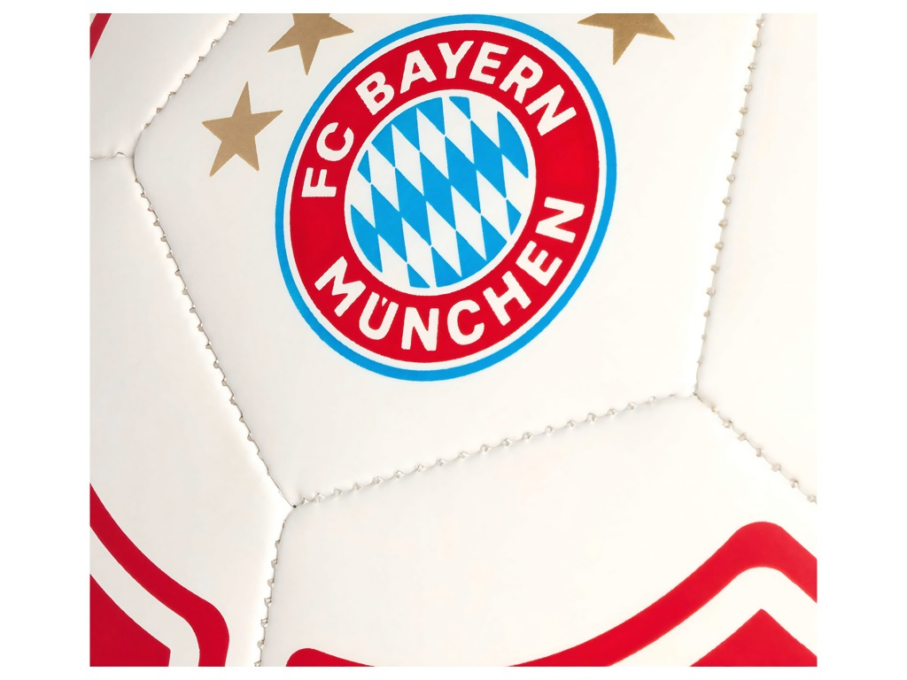Fotbalový míč FC Bayern Mnichov ve velikosti 1. Míč je v barvě bílé a červené s barevným znakem FC Bayern Mnichov a 5 hvězd. Vyroben z kvalitního polyuretanu, který nabízí odolnost a dlouhou životnost. S velikostí 1 je tento míč vhodný pro sběratelské účely nebo pro malé fanoušky.