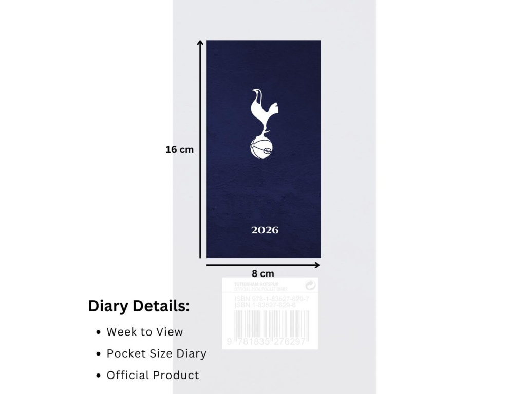 Kapesní týdenní diář Tottenham Hotspur FC na rok 2026 v rozměru 8 × 16 cm. Tmavě modré tvrdé desky s bílým klubovým znakem a rokem 2026 působí decentně. Týden je přehledně na dvou stranách s linkami pro poznámky. Uvnitř je anglické značení měsíců a dnů. Nechybí stužková záložka. Na stránkách je pole „Keeping Score“ pro záznam soupeře a výsledku. Vejde se do kapsy i do menší tašky.