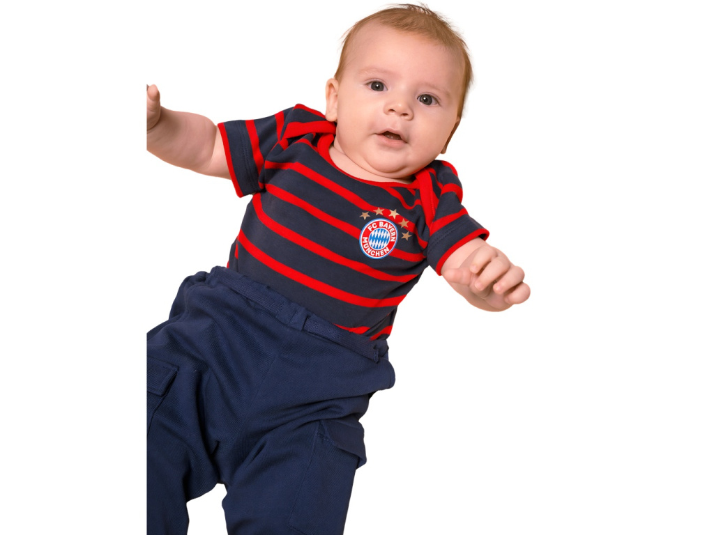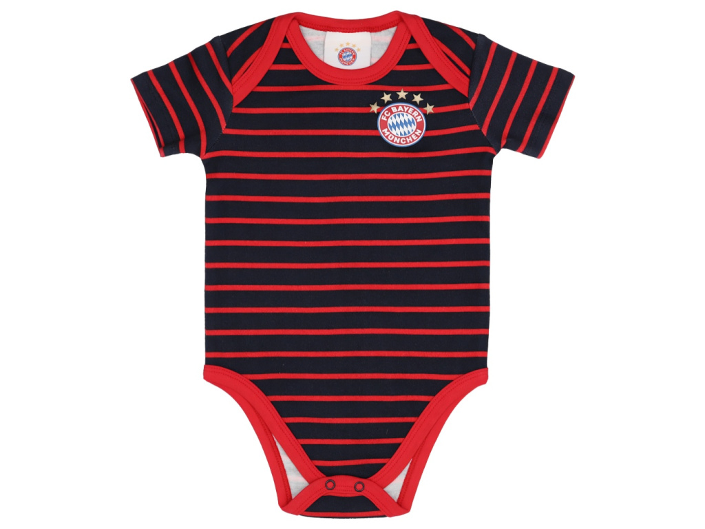 Kojenecké body FC Bayern Mnichov v červené a modré barvě. Barevný vyšitý znak uprostřed. Kvalitní 100% organická bavlna.