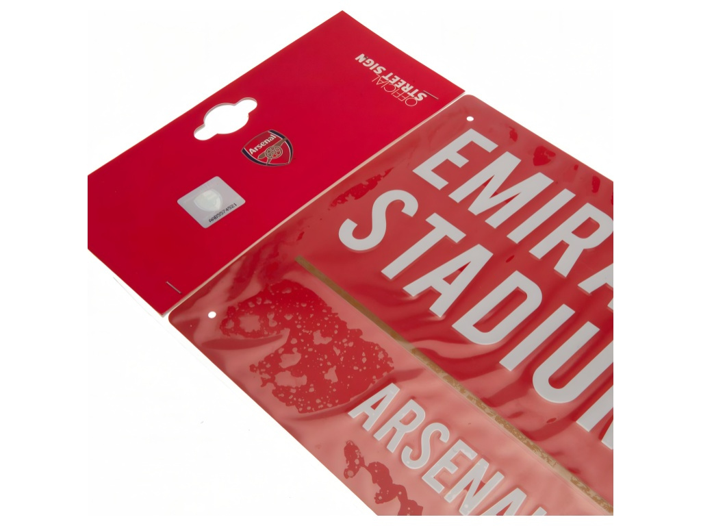 Kovová cedule Arsenal FC v lesklém provedení. Imitace dopravní značky. Červená a bílá barva. Nápis EMIRATES STADIUM Arsenal Football Club. Barevný znak klubu. Rozměr 40 x 18 cm. Předvrtané otvory pro snadné uchycení. Lakovaný povrch.
