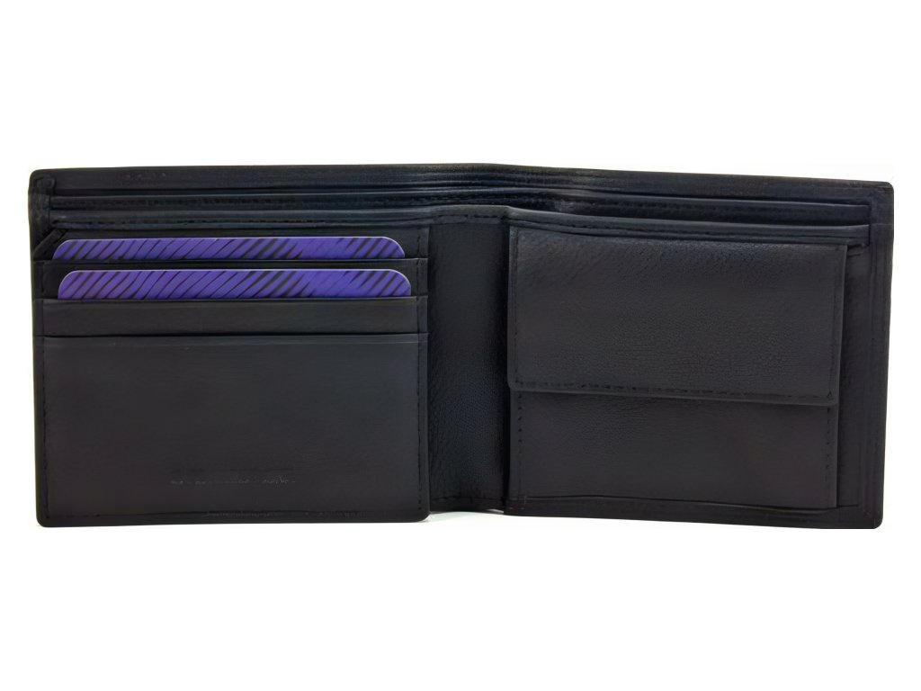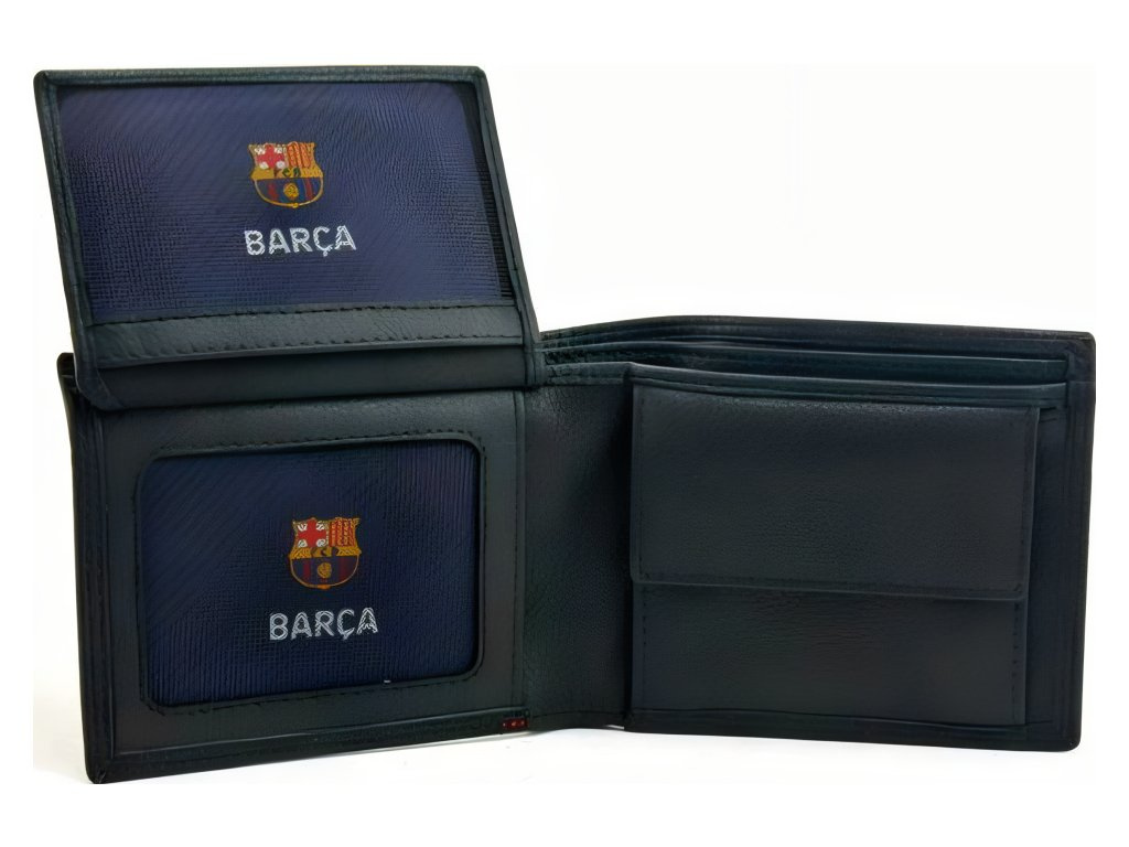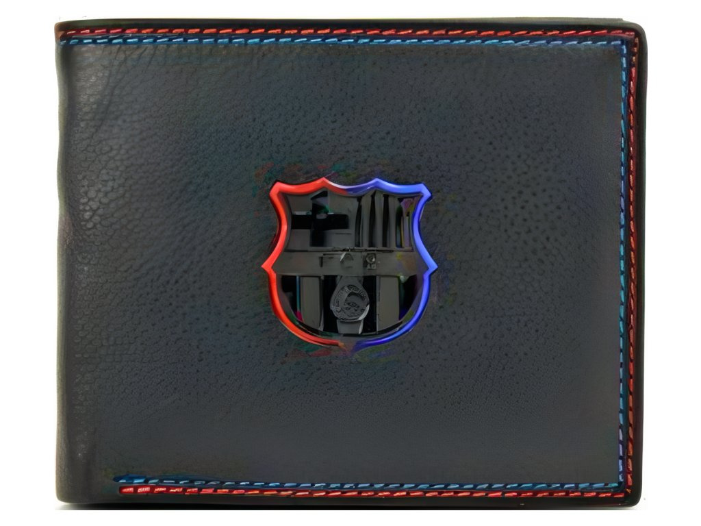Černá kožená peněženka FC Barcelona v klasickém formátu bifold pro každodenní nošení. Plastický klubový znak na přední straně a červeno‑modré prošívání dodají decentní klubový detail. Uvnitř je přehledné členění: kapsa na mince, dvě přihrádky na bankovky, tři sloty na karty a výklopná část se dvěma okénky na doklady. Tenký profil se pohodlně vejde do kapsy. Pravá kůže působí elegantně a je příjemná na dotek.