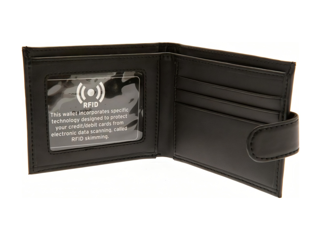 Kožená peněženka Liverpool FC v černém provedení pro fanoušky, kteří chtějí mít svůj klub po ruce. Tenký bifold formát se vejde do kapsy i do menší tašky. Pásek s patentem drží peněženku spolehlivě zavřenou. Integrovaná RFID vrstva chrání bezkontaktní karty před nežádoucím skenováním. Uvnitř jsou tři sloty na karty, průhledné okénko na doklad a dvě přihrádky na bankovky. Přední stranu zdobí decentní ražený znak L.F.C.