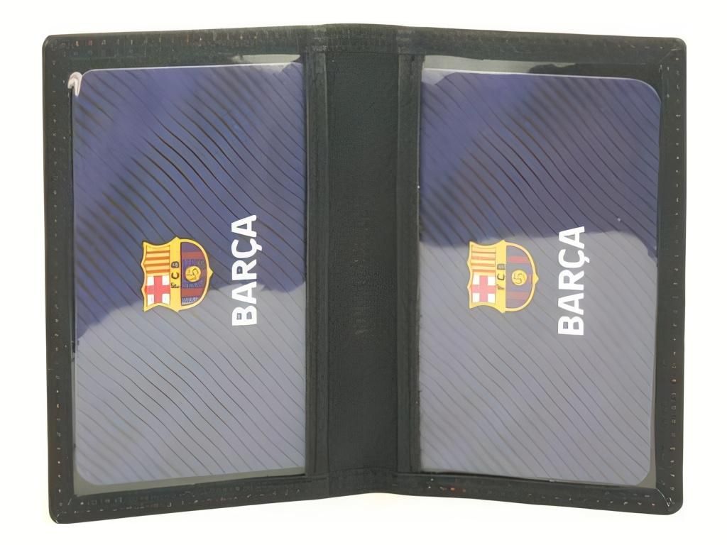 Kožené pouzdro na doklady FC Barcelona s embosovaným znakem klubu na přední straně. Kompaktní pouzdro na výšku z černé kůže pojme průkazy, kartičky i řidičák. Uvnitř najdeš dvě průhledné přihrádky s klubovým designem — znakem a nápisem BARÇA. Kontrastní prošívání v modré a vínové podtrhuje klubovou identitu.