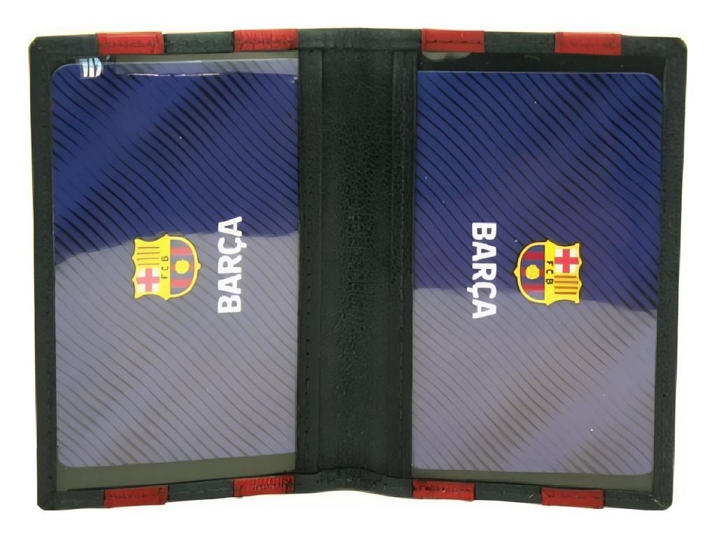 Kožené pouzdro na doklady FC Barcelona v klasických klubových barvách s kovovým znakem. Přední strana je zdobena svislými tmavě modrými a rudými pruhy s kontrastním prošitím — typický blaugrana design, který každý fanoušek pozná na první pohled. Uvnitř najdeš dva průhledné průhledy na doklady. Pouzdro se otevírá jako knížka a pojme občanský průkaz, řidičák nebo další doklady standardní velikosti.