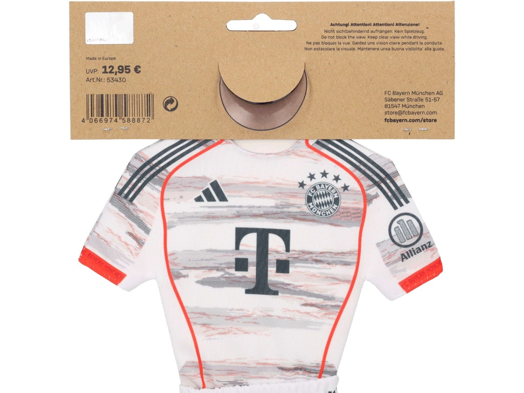 Mini dres do auta FC Bayern Mnichov s přísavkou a oboustranným motivem potěší každého fanouška na cestách. Bílé provedení se znakem klubu je dobře vidět. Tvar dresu a trenýrek působí jako malý set. Přísavka drží na hladkém skle. Rozměr 17 × 18 cm, lehký polyester. Instalace trvá pár vteřin.