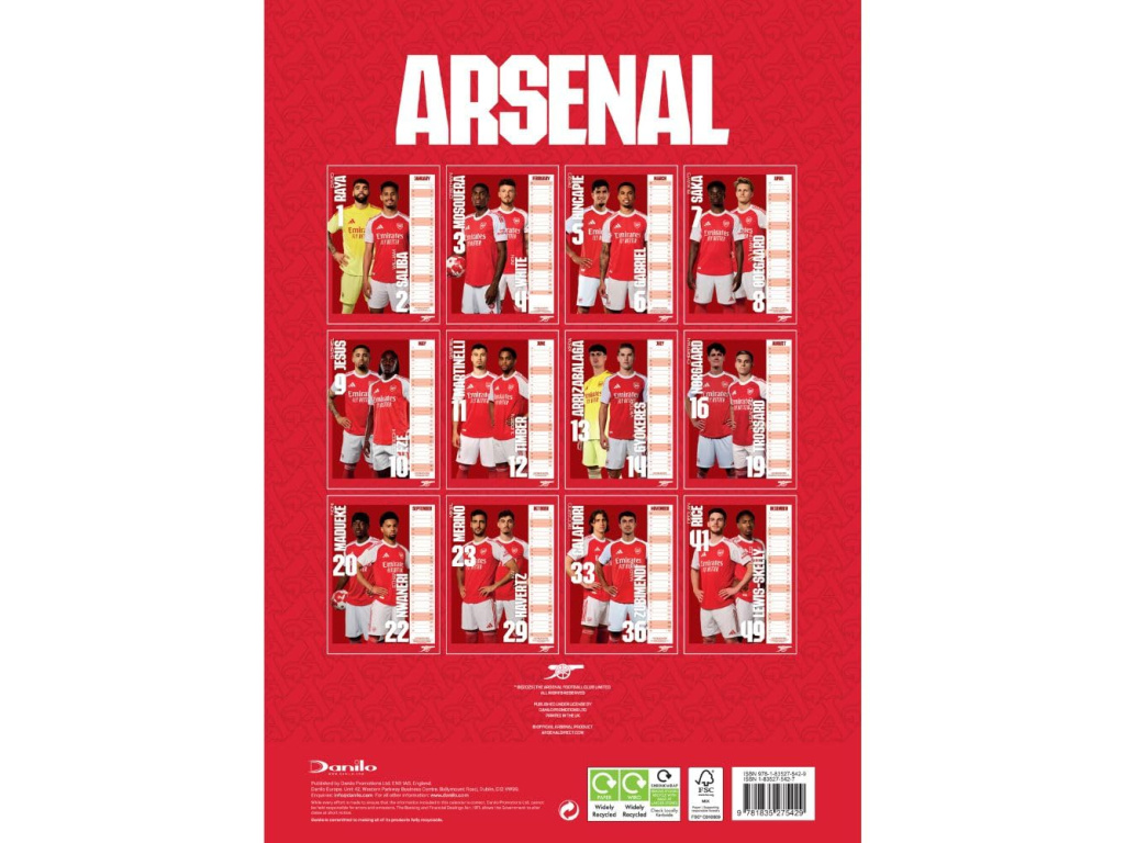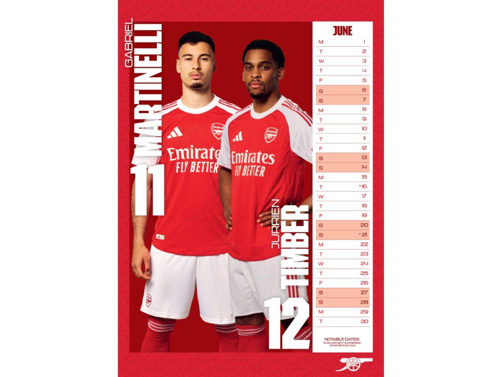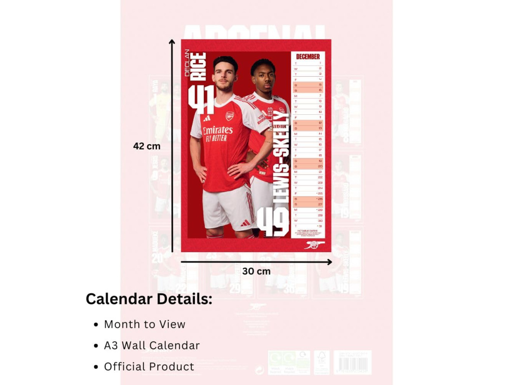 Nástěnný kalendář Arsenal FC 2026 ve formátu A3 pro přehledné plánování doma i v práci. Každá strana patří jednomu měsíci s velkou fotografií hráčů v klubových barvách. Sloupcové zobrazení dnů je rychlé na orientaci a nechá místo na poznámky. Kvalitní barevný tisk vynikne na zdi a podtrhne atmosféru zápasů. Ideální tip na dárek pro fanouška Arsenalu.