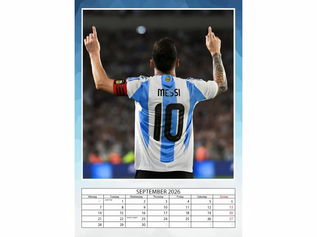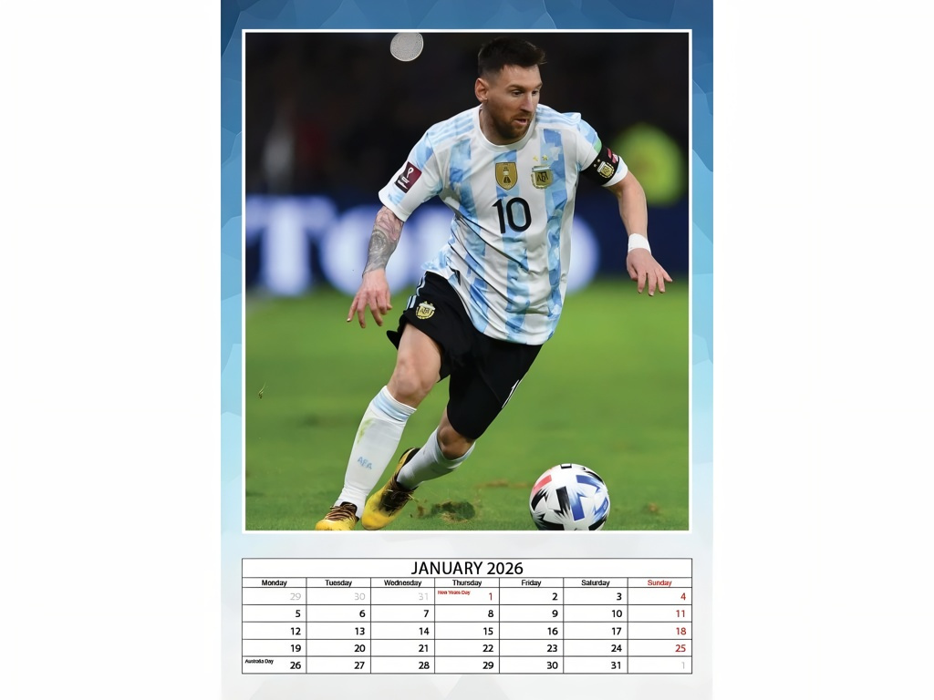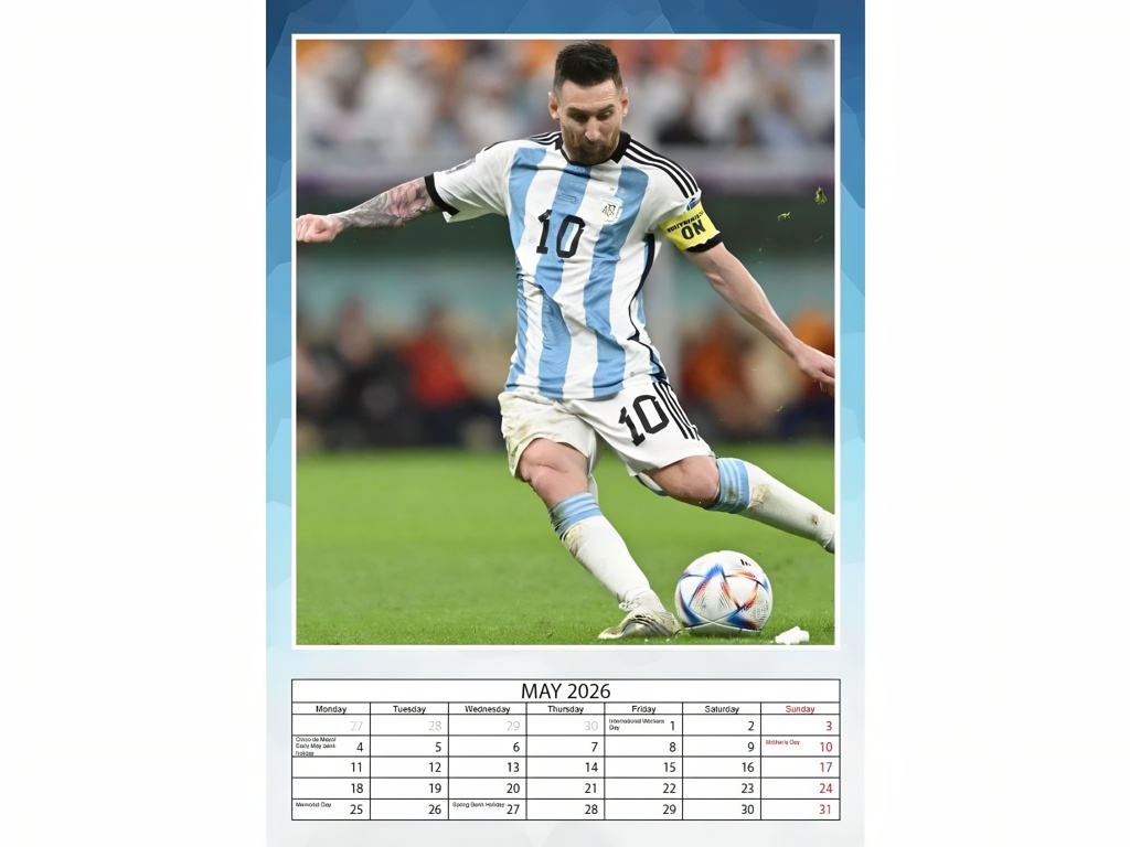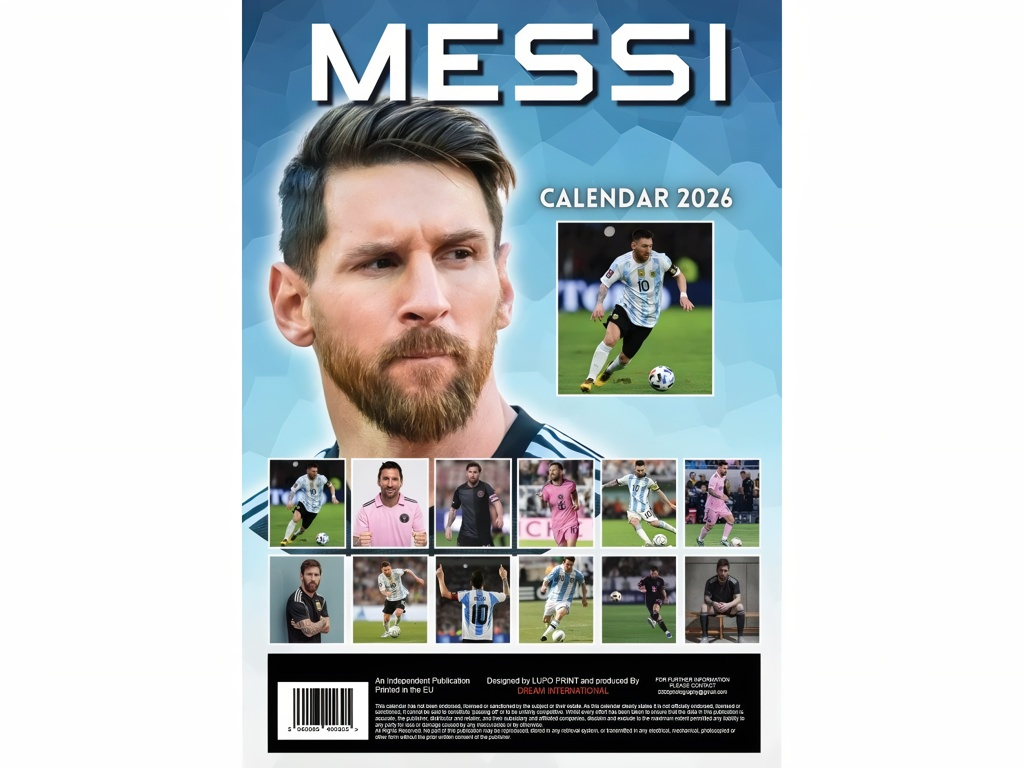 Nástěnný kalendář Lionel Messi 2026 ve formátu A3 potěší fanoušky, kteří chtějí mít přehled i motivaci na očích. Každý měsíc doplňuje velká fotografie a přehledné kalendárium v angličtině. Lesklý papír zvýrazní barvy. Stránky lze po měsíci využít jako plakát. V horní části je otvor pro zavěšení.