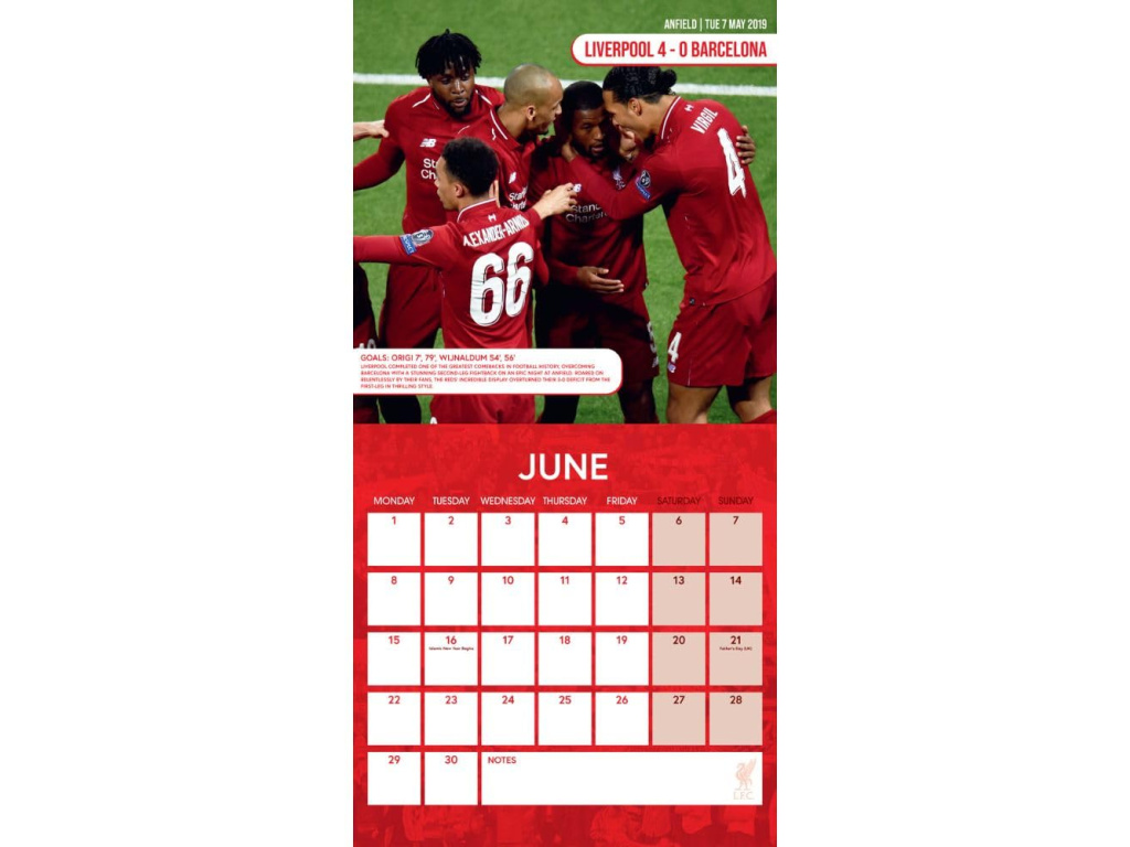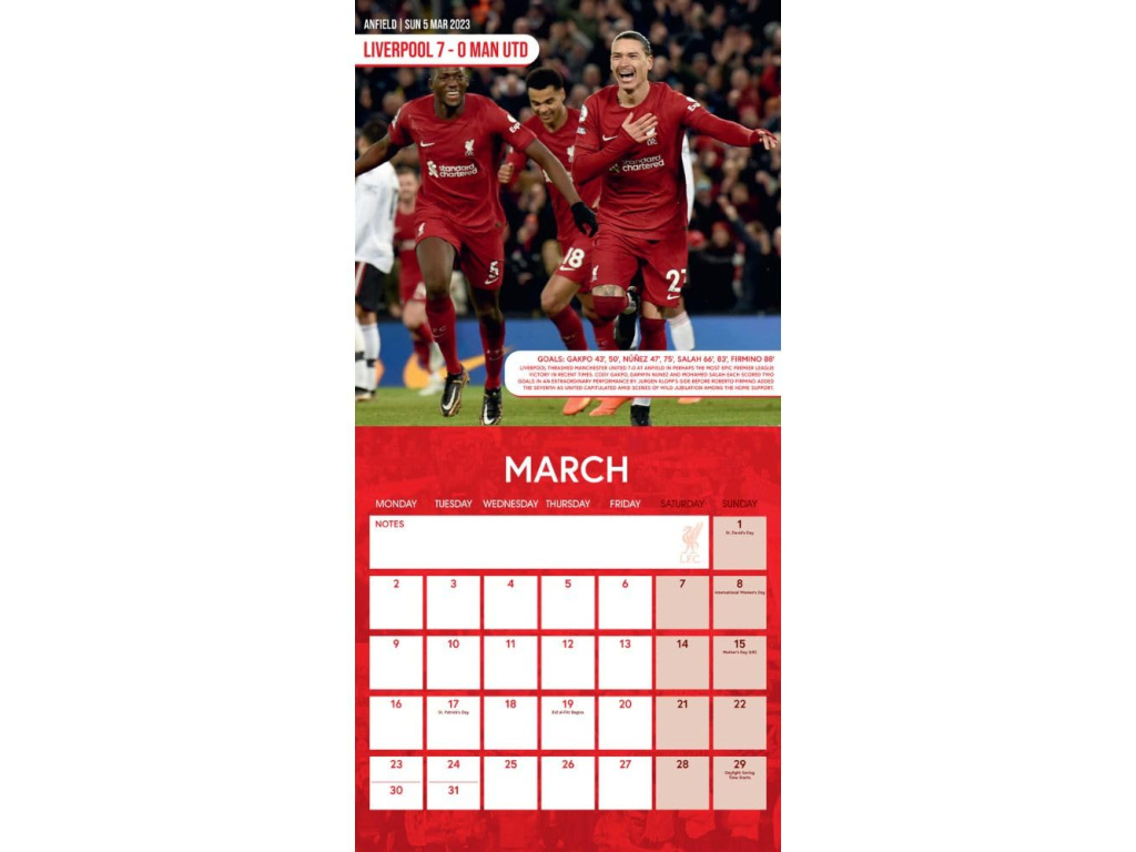 Nástěnný kalendář Liverpool FC 2026 zachycuje největší zápasy na Anfieldu v syté klubové červené. Čtvercový formát 30 × 30 cm se hodí na každou zeď. Měsíční přehled vede dny pondělí–neděle a má vyhrazené pole na poznámky. Každý měsíc doplňuje velká fotografie ze slavného utkání včetně výsledku a střelců (např. Liverpool 7–0 Man Utd, 5. 3. 2023; Liverpool 4–0 Barcelona, 7. 5. 2019). Na obálce dominuje znak klubu. Barevný tisk potěší fanoušky i jako dárek.