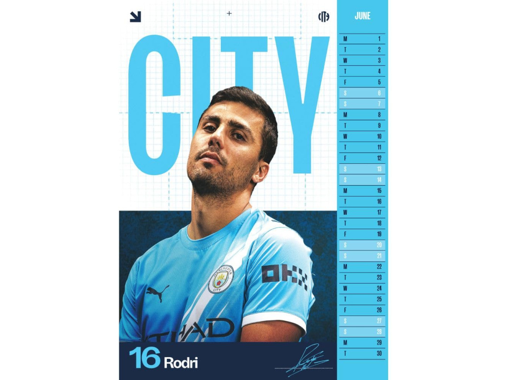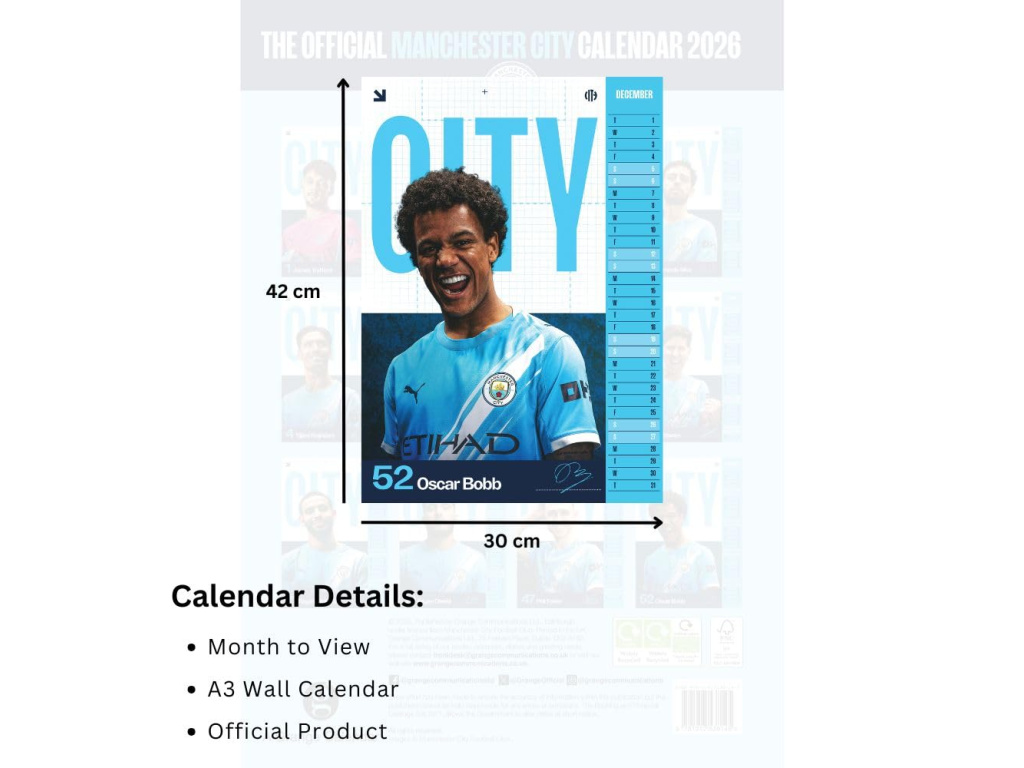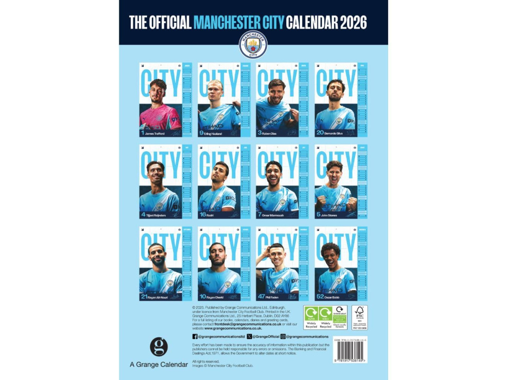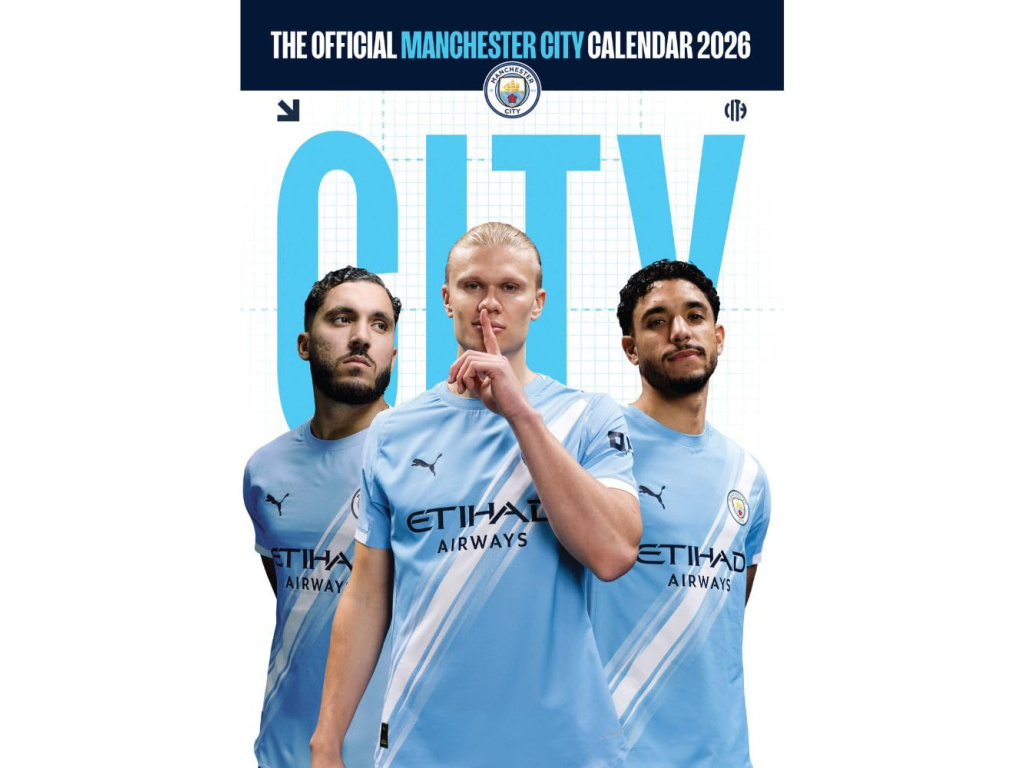 Nástěnný kalendář Manchester City FC 2026 v rozměru A3 potěší každého fanouška. Velké fotografie hráčů doplňuje přehledné kalendárium v bočním sloupci. Data jsou dobře čitelná i z větší dálky. Světle modré klubové barvy a znak na titulní straně. Hodí se do pracovny, pokojíku i fanouškovského koutku.