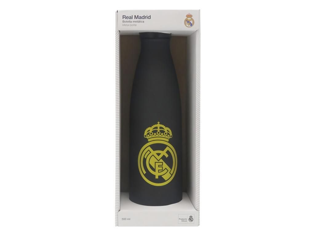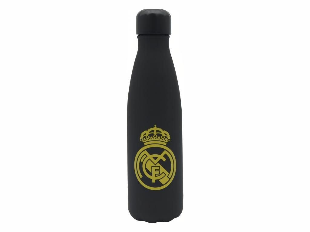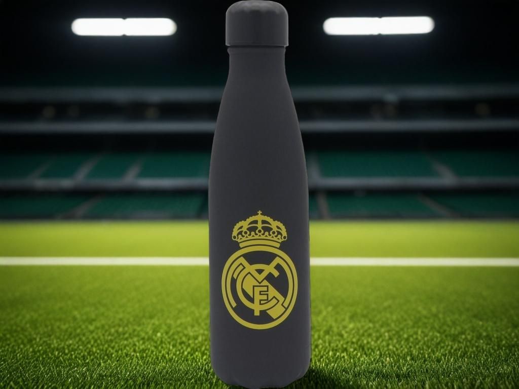 Nerezová termoláhev Real Madrid s pogumovaným povrchem a dvojitou stěnou. Objem 500 ml a izolace z nerezové oceli udrží teplý nápoj až 12 hodin a studený až 24 hodin. Matný černý povrch nese znak klubu na přední straně a nápis REAL MADRID na zadní. Šroubovací uzávěr zajistí těsnost a hrdlo o průměru 34 mm pojme i kostky ledu. Pogumovaný povrch příjemně padne do ruky a neprokluzuje. Potisk je provedený UV technologií — je hmatatelný a odolný proti oděru.