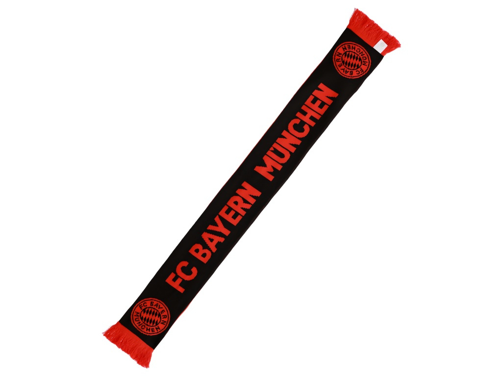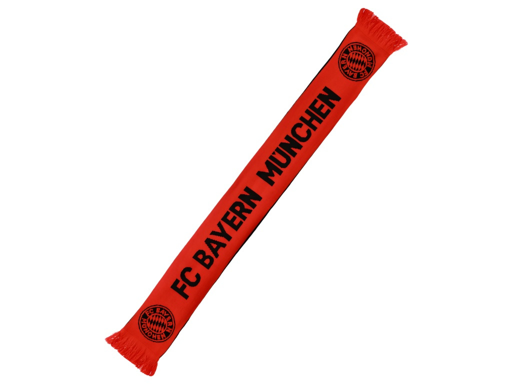 Oboustranná šála FC Bayern Mnichov v červeno‑černém provedení s červenými střapci. Jedna strana je černá s červeným nápisem FC BAYERN MÜNCHEN a klubovým znakem na obou koncích, druhá je červená s černým nápisem a znaky. Měkký úplet z 100% akrylu příjemně hřeje, drží tvar a rychle schne. Rozměr 140 × 17 cm se pohodlně ovine kolem krku. Dvě barevné varianty v jednom kousku pro stadion i do města.
