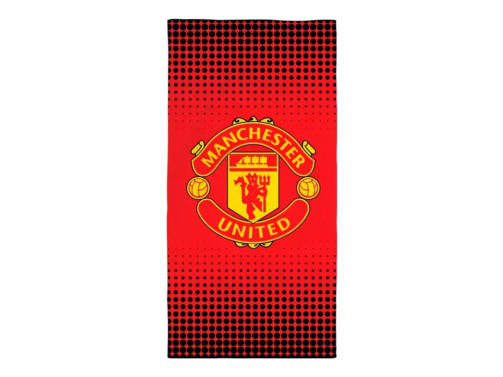 Bavlněná osuška Manchester United s výrazným znakem klubu na červeném podkladu. Rozměr 75 × 150 cm pohodlně pokryje celé tělo. Materiál 100% bavlna příjemně savá a rychle schne. Červený střed plynule přechází do černého halftone vzoru u horního i spodního okraje. Uprostřed dominuje velký znak Manchester United ve žluto-červeném provedení.