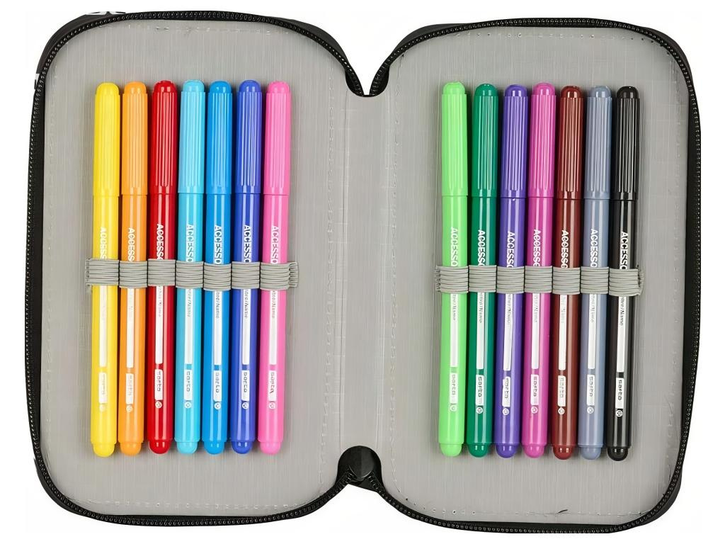 Tohle je penál, se kterým první den školy prostě zaboduje každý fanoušek Barcy. Všech 29 kusů je přehledně roztříděných ve dvou patrech — v jednom propisky, tužka, guma a ořezávátko, ve druhém kompletní sada pastelek a fixů. Stačí otevřít a hned je jasné, kde co je. Černý design s klubovým znakem sedí ke každému batohu a nenápadně ukazuje, komu jeho majitel fandí.