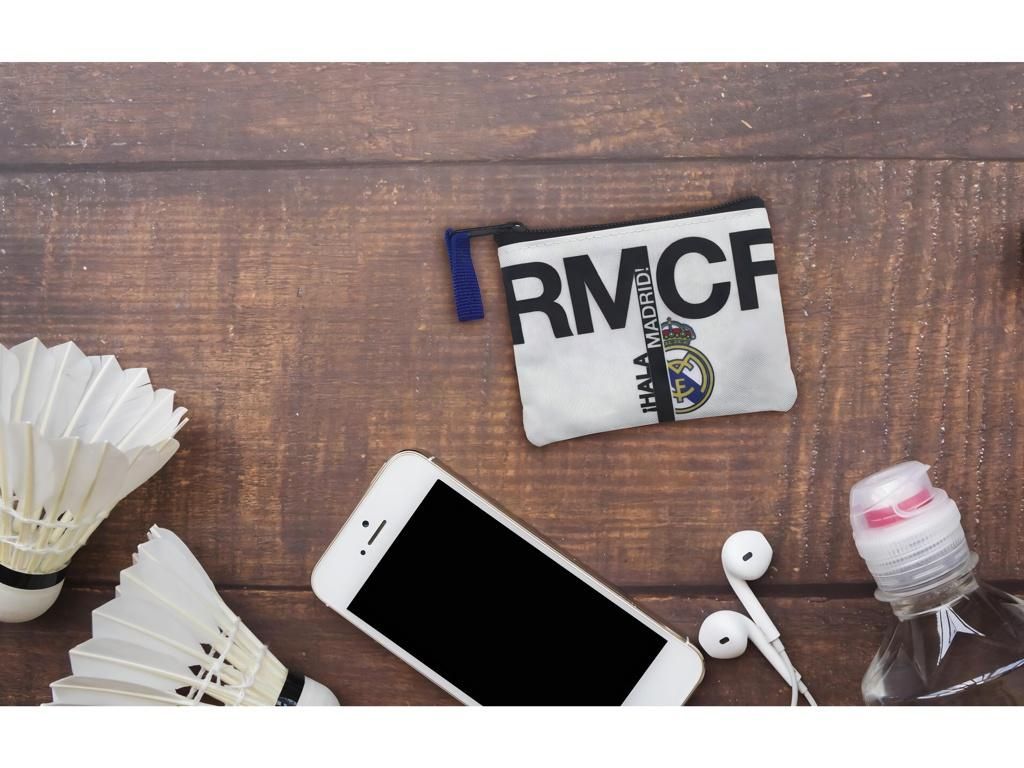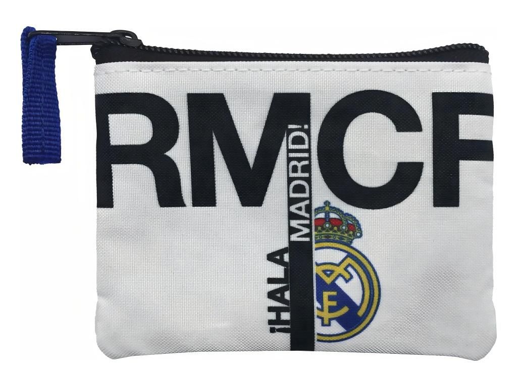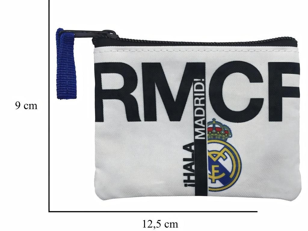 Peněženka na mince Real Madrid na zip z odolného polyesteru. Přední strana je bílá s velkým černým nápisem RMCF, svislým pruhem ¡Hala Madrid! a znakem klubu. Zadní strana je celá modrá. Zip po celé šířce usnadňuje přístup dovnitř a modré textilní poutko na táhle pomáhá při otevírání. Kompaktní rozměr mincovky 12,5 × 9 cm se pohodlně vejde do kapsy bundy i batohu.