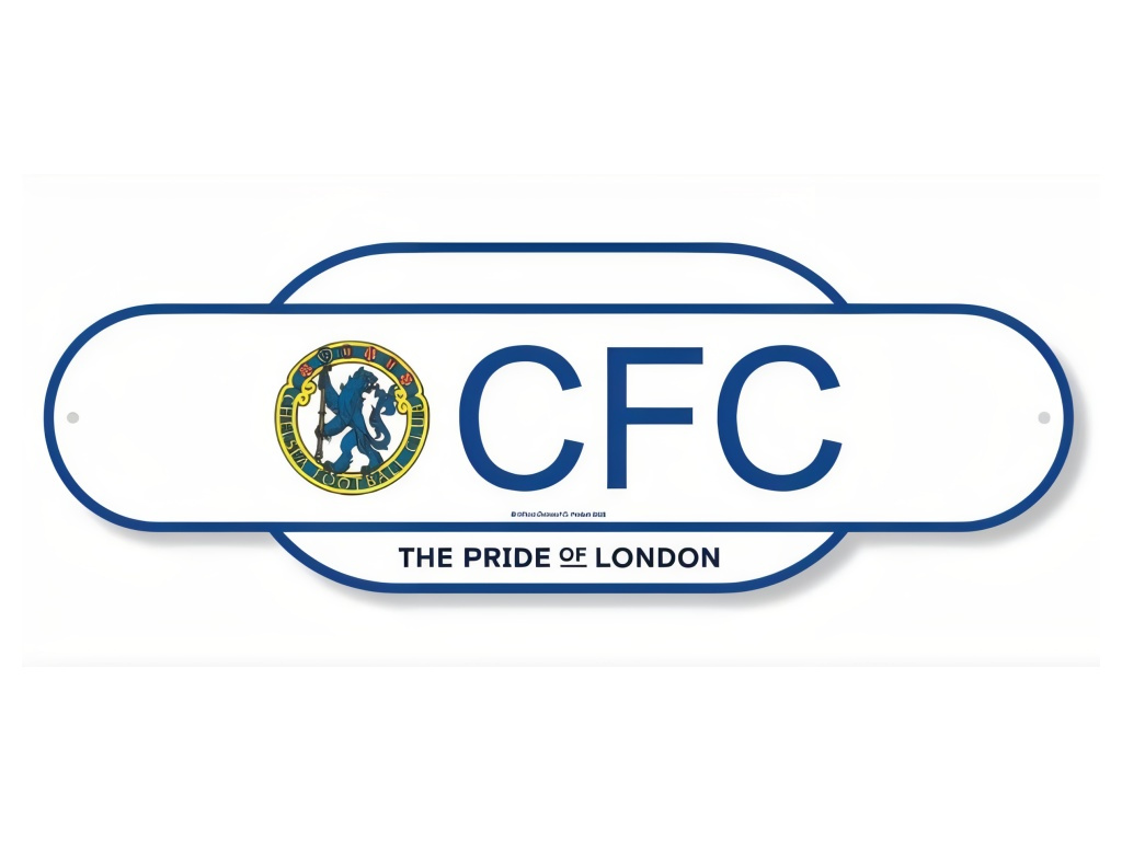 Plechová cedule Chelsea FC s motivem CFC – THE PRIDE OF LONDON a retro znakem skvěle doplní fanouškovský koutek doma i v garáži. Bílé provedení s modrým lemováním odpovídá klubovým barvám. Dvě předvrtané dírky po stranách umožní rychlé zavěšení. Pevný plech dobře drží tvar. Štíhlý formát snadno umístíte nad stůl či na dveře.