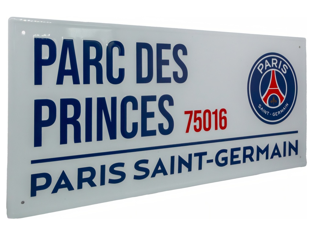 Cedule Paris Saint-Germain z plechu s lesklým povrchem vynikne na zdi pokoje, pracovny i garáže. Vyrobeno z plechu; rozměr 40 × 18 cm se hodí nad stůl, do chodby i do fan zóny. Přední stranu zdobí motiv Parc des Princes 75016 a klubový znak. Čtyři předvrtané otvory usnadní montáž. Potisk je čistý a dobře čitelný na bílém podkladu.