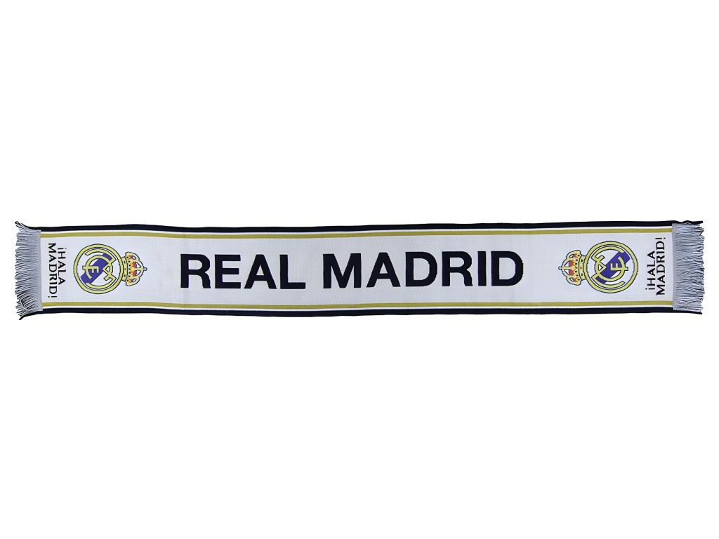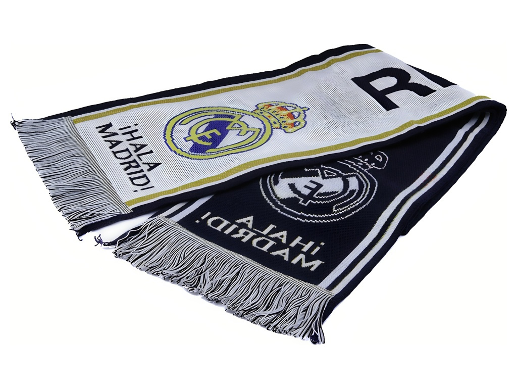 Pletená oboustranná šála Real Madrid pro fanoušky, kteří chtějí ukázat klubové barvy i v zimě. Jedna strana je světlá s tmavě modrými nápisy, druhá černá se světlým motivem. Po celé délce je nápis REAL MADRID, na koncích klubový znak a heslo ¡Hala Madrid!. Lemy doplňuje zlatavý proužek a konce jsou zakončené střapci. Příjemně hřeje a dobře se nosí.
