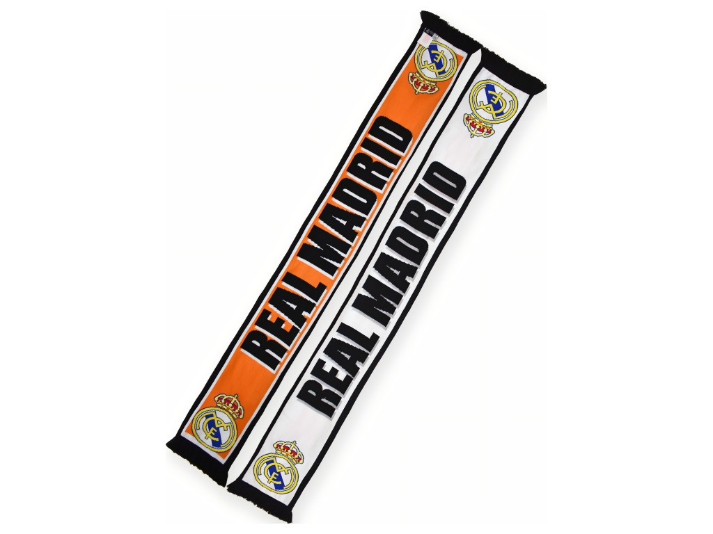 Oboustranná pletená šála Real Madrid pro fanoušky na stadion i do města. Jedna strana bílá, druhá oranžová. Uprostřed velký nápis REAL MADRID, na koncích vpletený klubový znak. Měkký akryl hřeje a dobře drží tvar. Černé třásně na koncích.