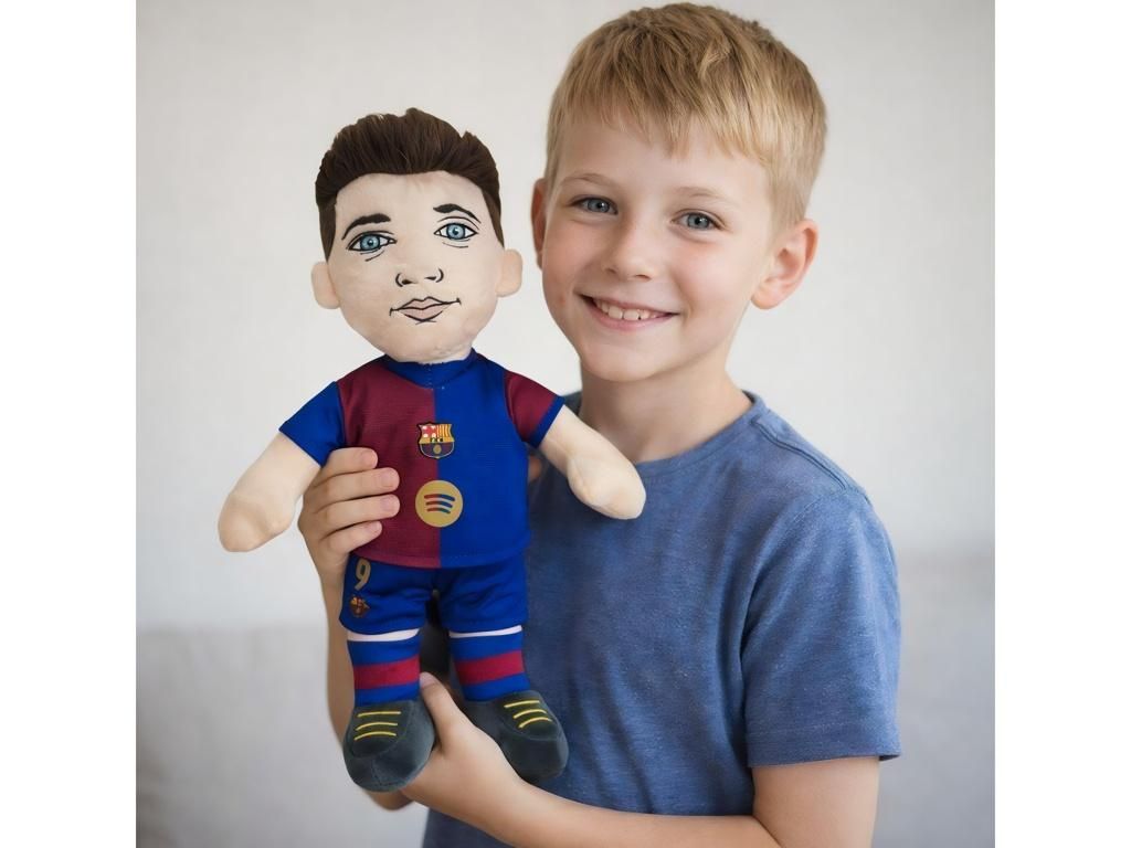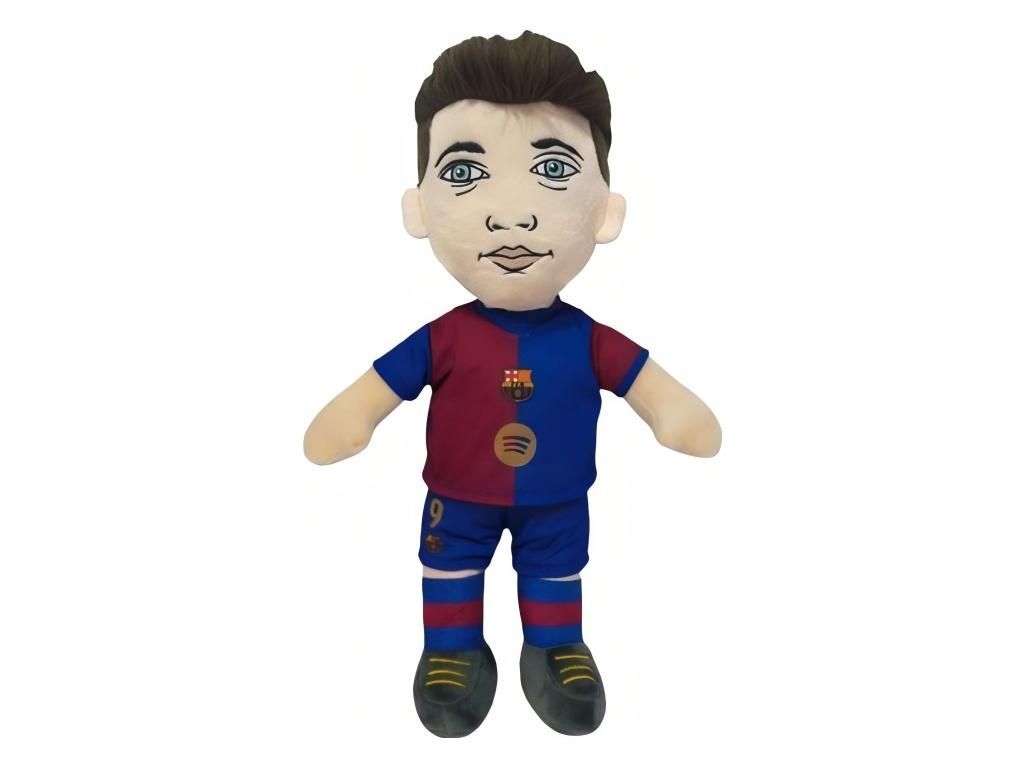 Plyšová figurka Roberta Lewandowski v domácím dresu FC Barcelona. Čtyřiceticentimetrový plyšák z 100% polyesteru je měkký na dotek a příjemně se drží. Lewandowski má na sobě ikonický modro-vínový dres s číslem 9, znakem klubu na hrudi a tmavými kopačkami. Hodí se jako společník do postýlky, dekorace na poličku i parťák na cestu na stadion.